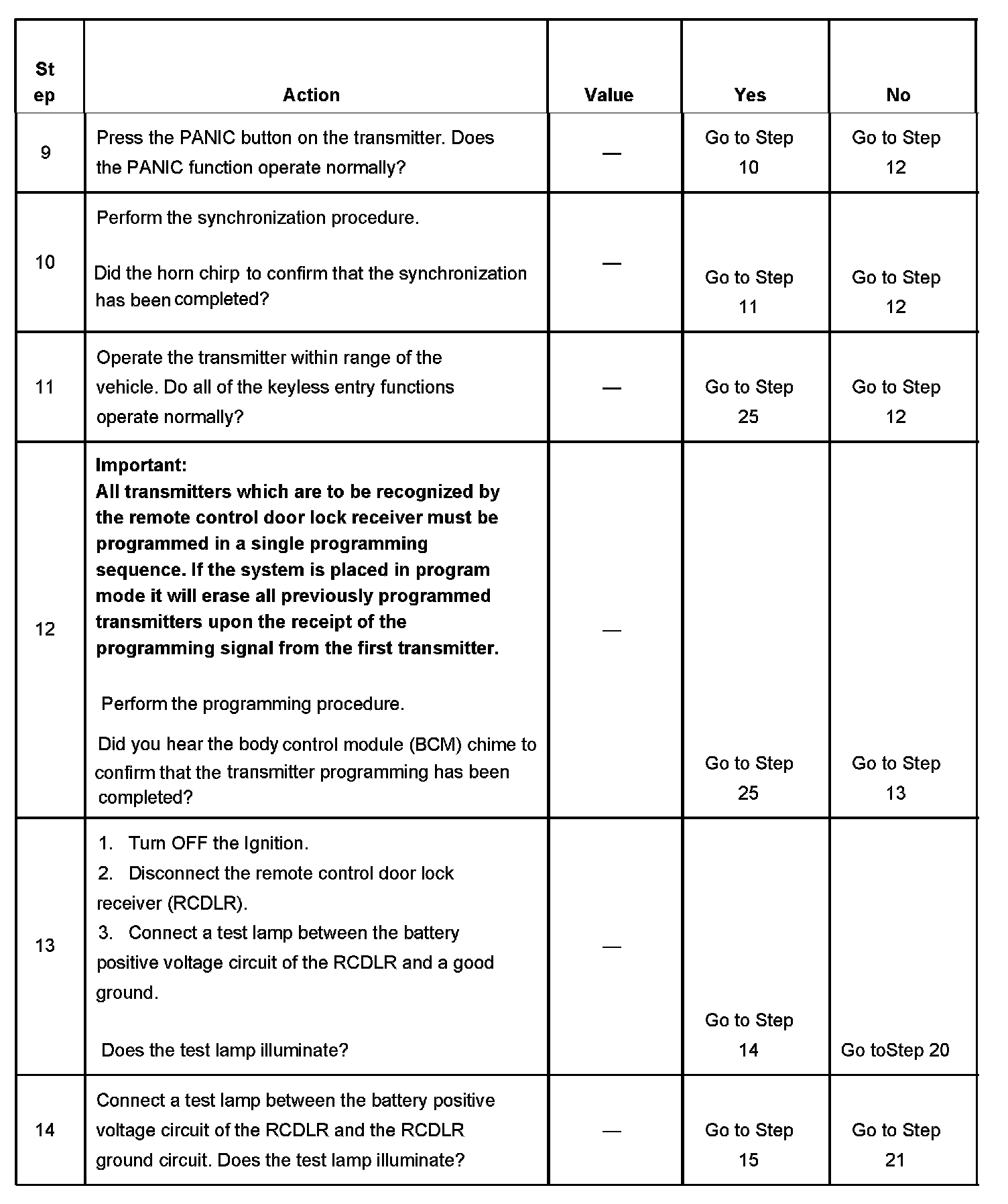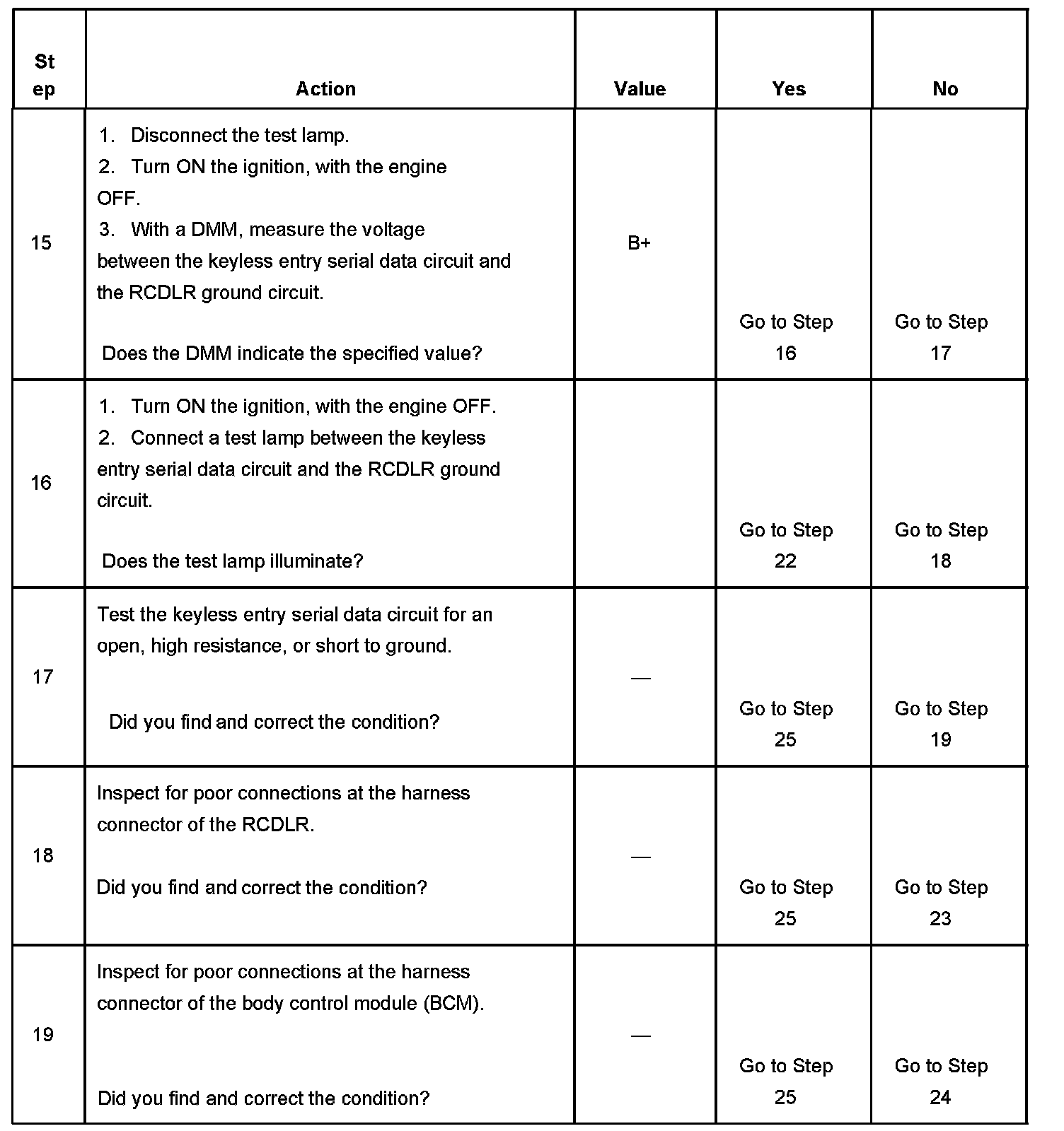 16. An illuminated test lamp at step 16 reveals a short to voltage in the serial data circuit.
