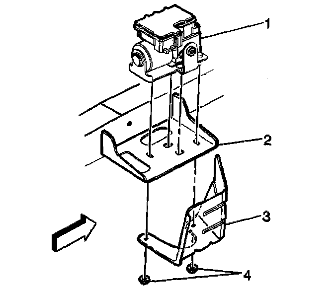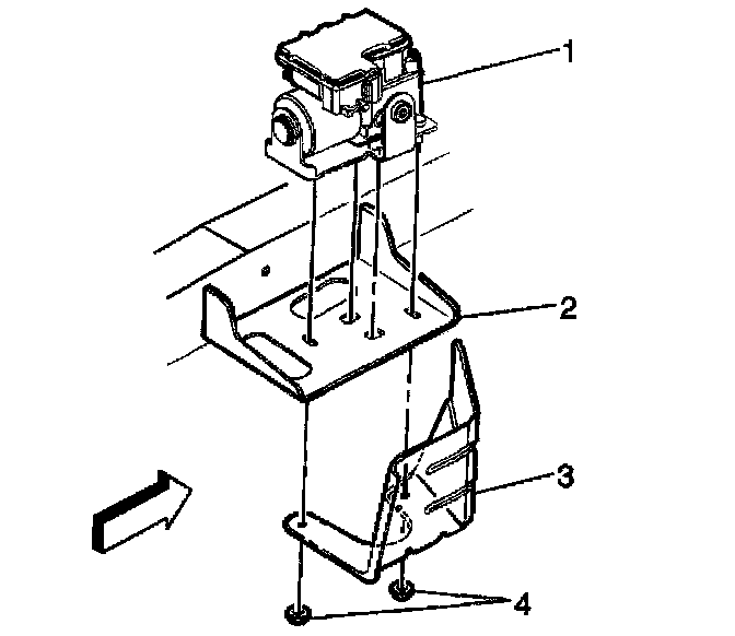4. Secure the module (1) to the frame bracket (3) and fuel pipe shield (2) with the two nuts (4).