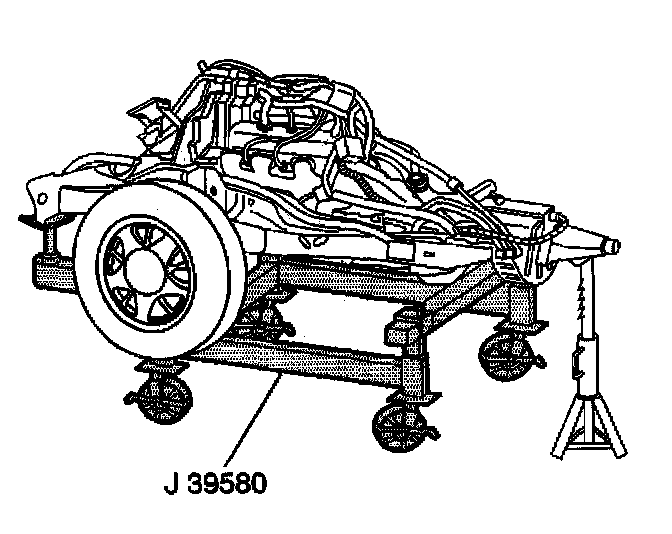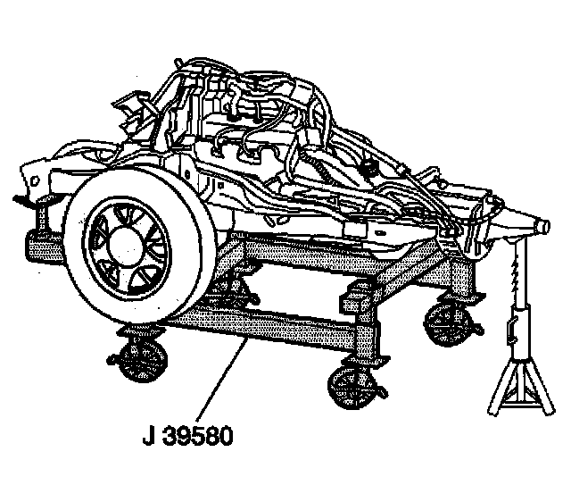 58. Place a jack stand under the transmission crossmember to prevent the engine/frame assembly from tipping off of the J 39580.