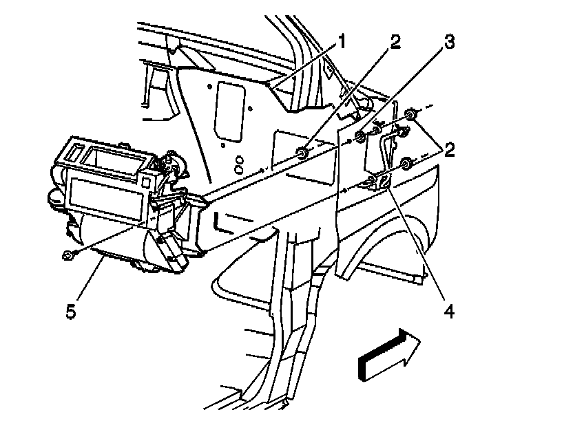 10. Remove the heater case (5) from the vehicle.