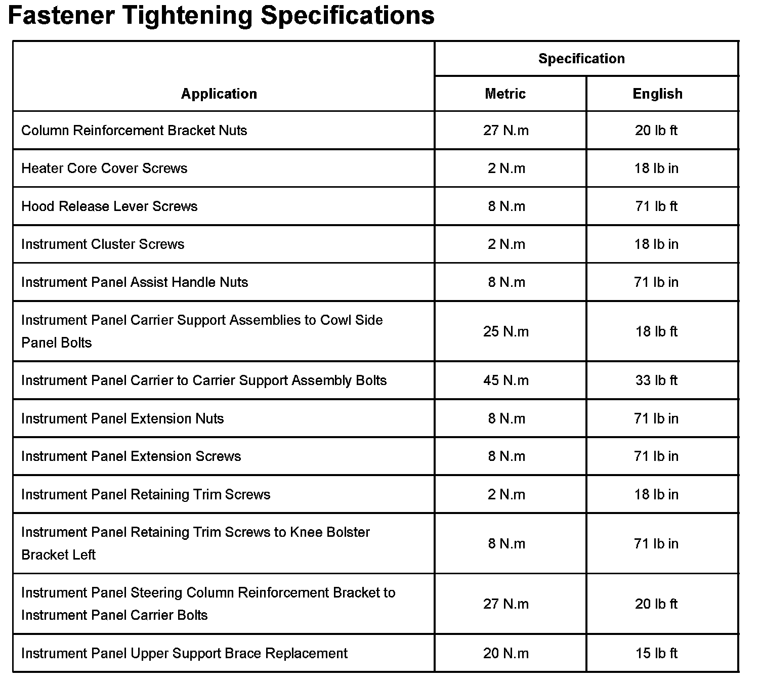 Instrument Panel, Gauges and Warning Indicators: Specifications