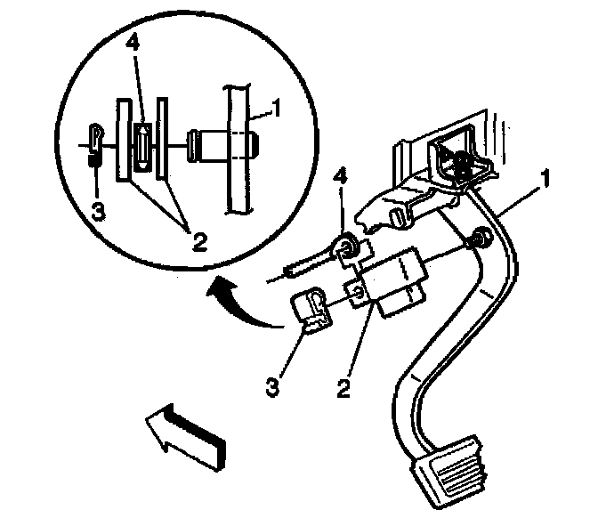 3. Unsnap the switch (2) and pushrod (4) from the brake pedal (1) pin.