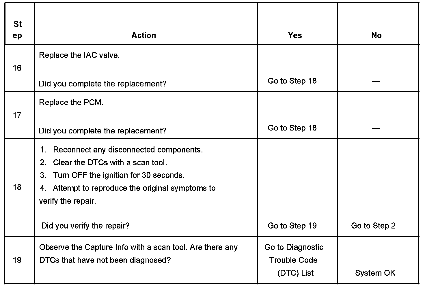 The engine idle speed is controlled by the idle air control (IAC) valve. The IAC valve is on the throttle body. The IAC valve pintle moves in and out of an idle air passage bore to control air flow around the throttle plate. The IAC valve consists of a movable pintle, driven by a gear attached to an electric motor called a stepper motor. The stepper motor is capable of highly accurate rotation, or of movement, called steps. The stepper motor has 2 separate windings that are called coils. Each coil is supplied current by two circuits from the powertrain control module (PCM). When the PCM changes polarity of a coil, the stepper motor moves one step. The PCM uses a predetermined number of counts to determine the IAC pintle position. Observe IAC counts with a scan tool. The IAC counts will increment up or down as the PCM attempts to change the IAC valve pintle position. An IAC Reset will occur when the ignition key is turned OFF. First, the PCM will seat the IAC pintle in the idle air passage bore. Second, the PCM will retract the pintle a predetermined number of counts to allow for efficient engine start-up. If the engine idle speed is out of range for a calibrated period of time, an idle speed diagnostic trouble code (DTC) sets.