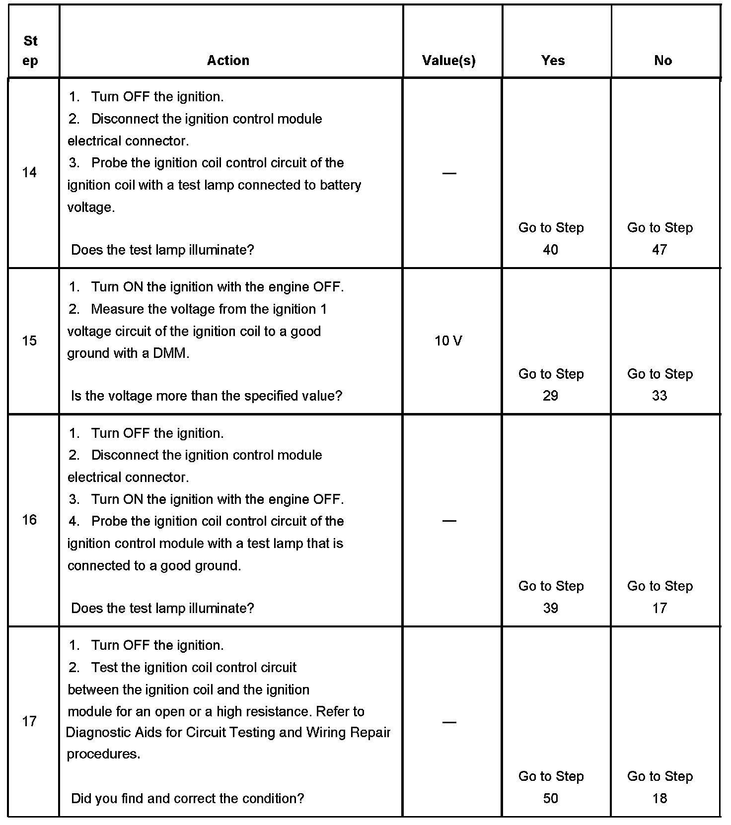 The numbers below refer to the step numbers on the diagnostic table.