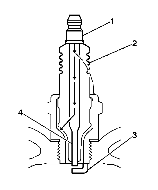 - Inspect for signs of tracking that occurred near the insulator tip instead of the center electrode (4).