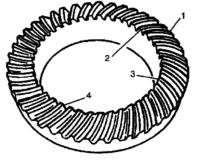 The side of the ring gear tooth which curves outward, or is convex, is the drive side (4). The concave side is the coast side (3). The end of the tooth nearest the center of the ring gear is the toe end (2). The end of the tooth farthest away from the center is the heel end (1).