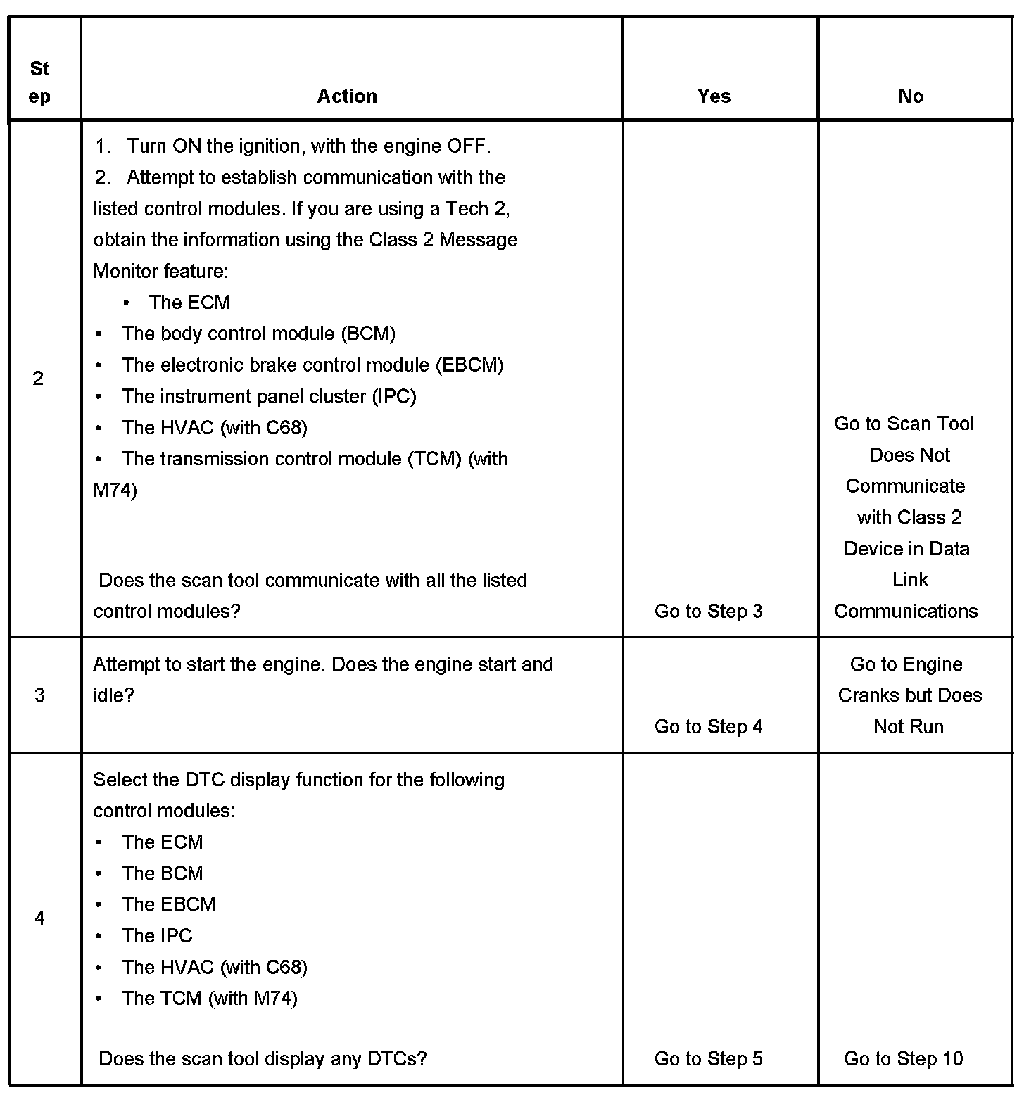 2. Lack of communication may be because of a partial or a total malfunction of the class 2 serial data circuit. The specified procedure determines the particular condition.