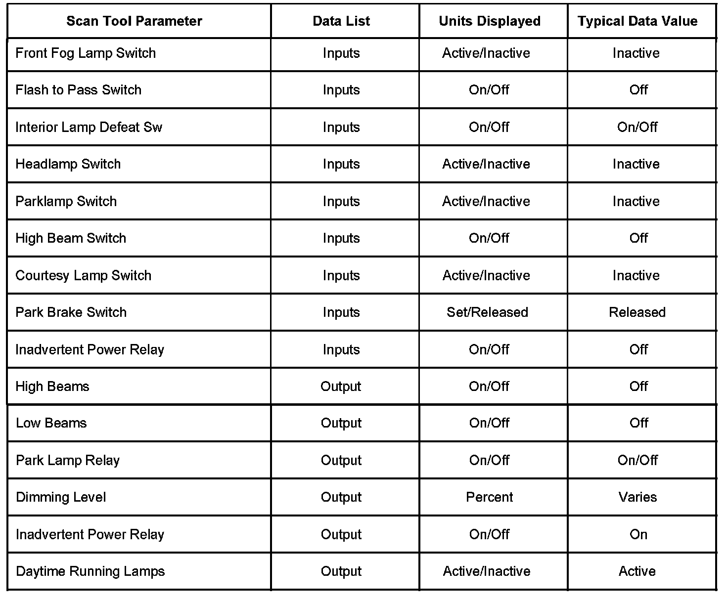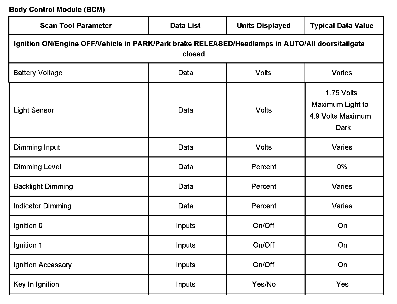 Scan Tool Data List - Body Control Module (BCM)