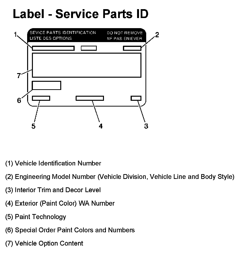 The Service Parts Identification Label aids the service personnel in identifying the parts and options originally installed on the vehicle.