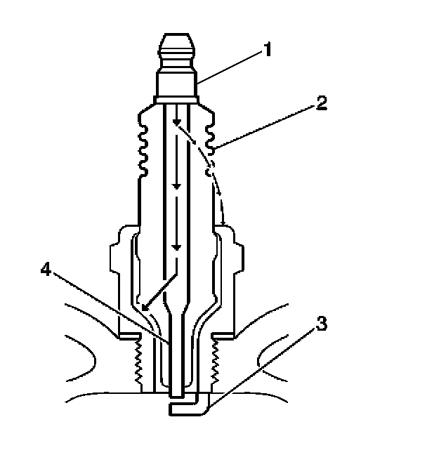 - Inspect for signs of tracking that occurred near the insulator tip instead of the center electrode (4).