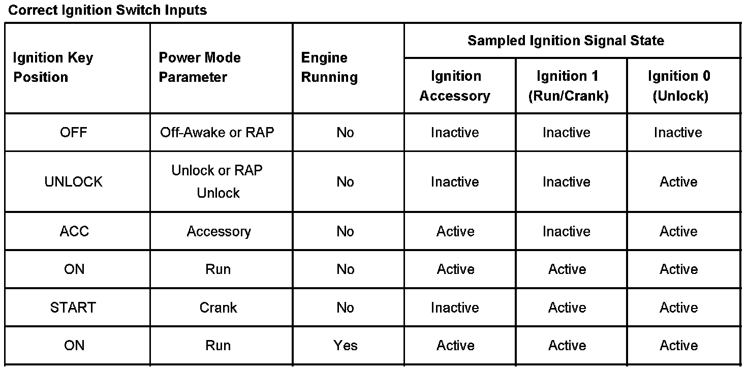 On vehicles that have several control modules connected by serial data circuits, one module is the power mode master (PMM). On this vehicle the PMM is the Body Control Module (BCM). The BCM uses 3 signals from the ignition switch. These are the Ignition 0 (Unlock), Ignition 1 (Run/Crank), and Accessory.