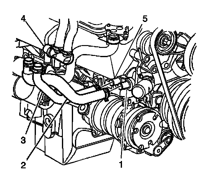 4. Remove the upper heater inlet hose clamp and the upper heater outlet hose clamp from the inlet of the coolant bypass valve (4) using the J 38185.