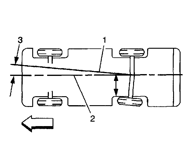In the illustration, toe-in is shown on the left rear wheel, moving the thrust line (1) off center. The resulting deviation from the centerline is the thrust angle.