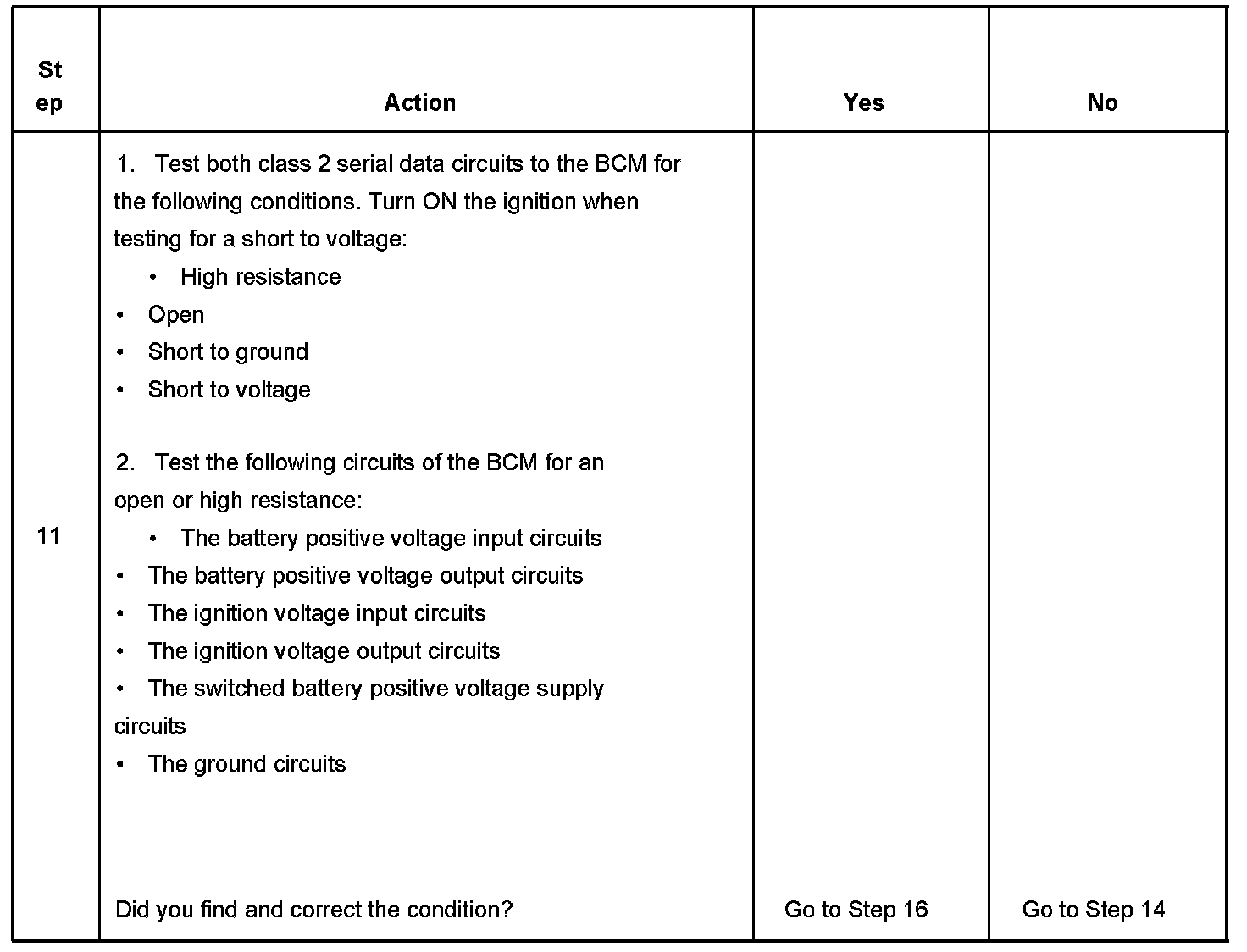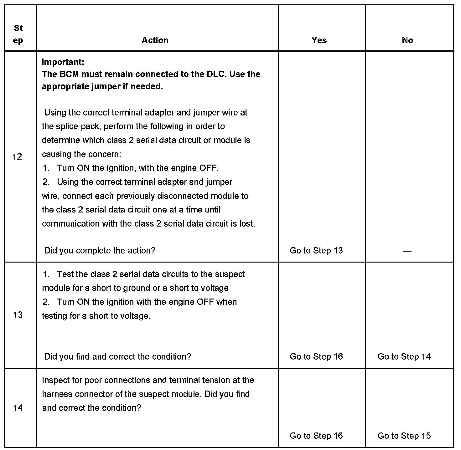 12. Normal class 2 serial data communication cannot take place until the body control module (BCM) sends the appropriate power mode message. If the BCM does not send a wake-up message, other modules on the class 2 serial data circuit may not communicate.