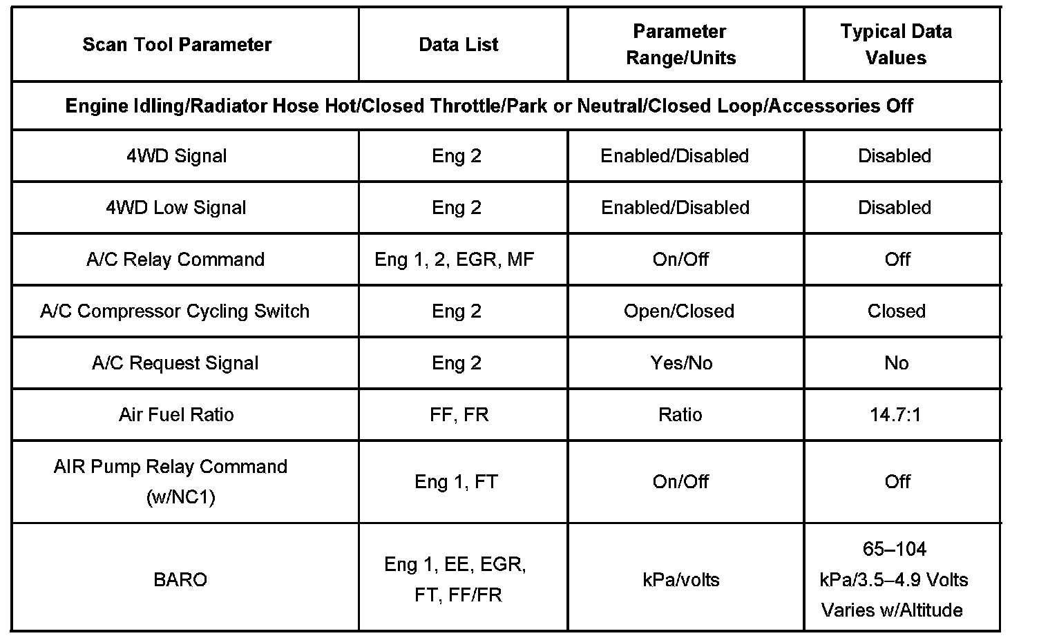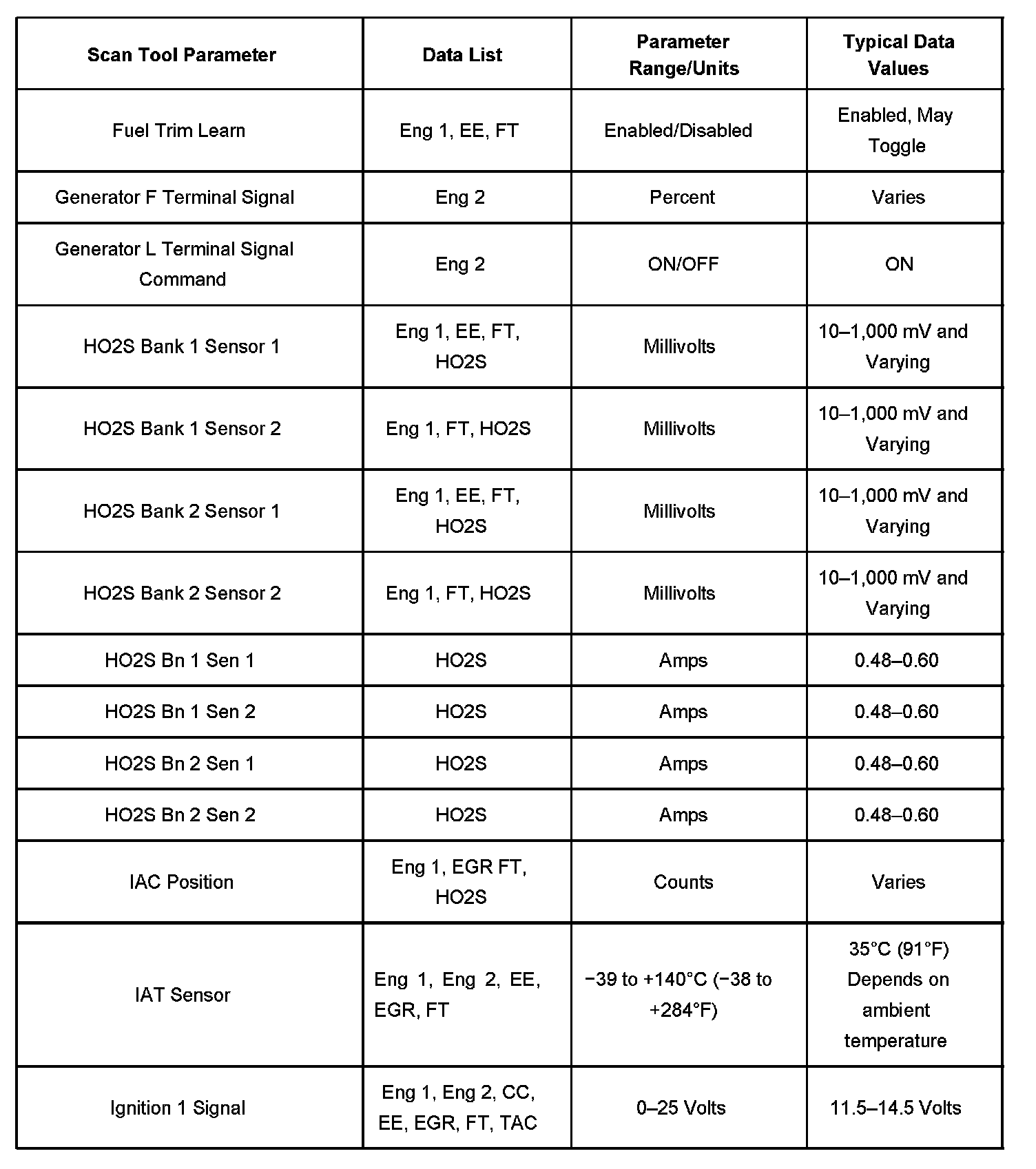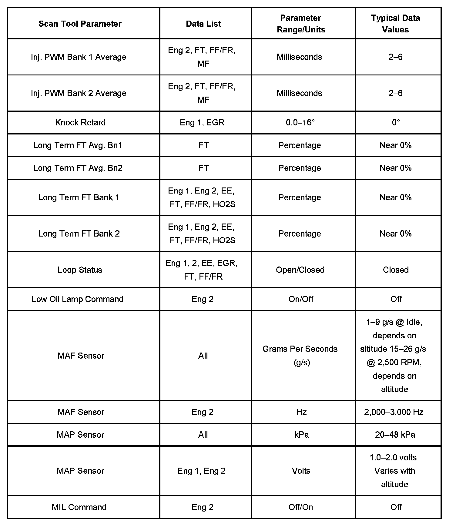 Scan tool values from a properly running engine may be used for comparison with the engine you are diagnosing. The Engine Scan Tool Data List represents values that would be seen on a normal running engine.