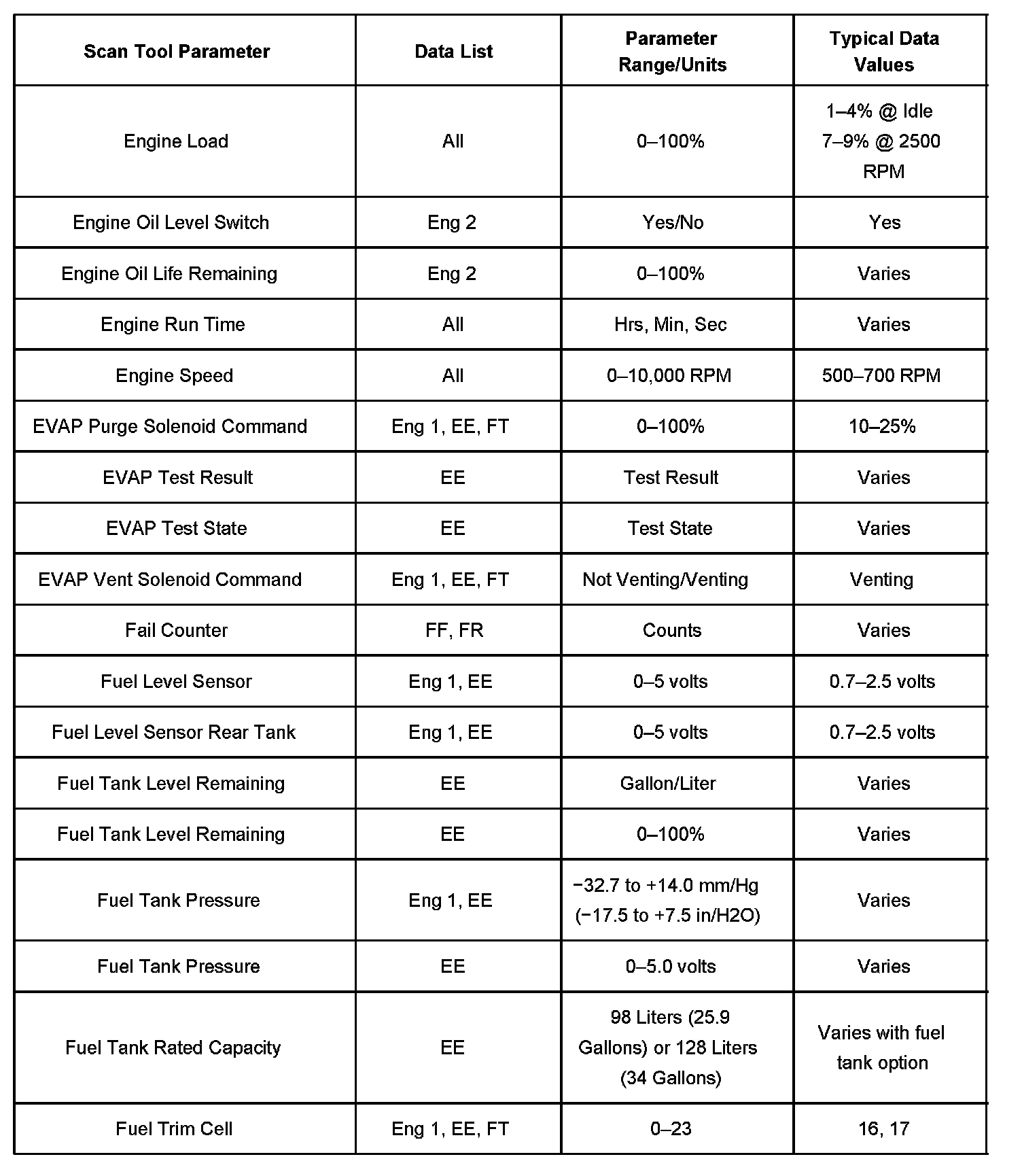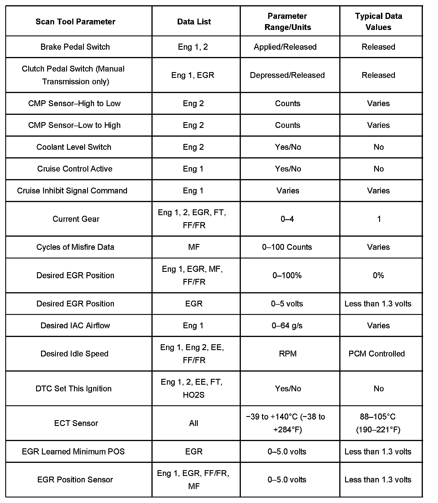 The Engine Scan Tool Data List contains all engine related parameters that are available on the scan tool. The list is arranged in alphabetical order. A given parameter may appear in any one of the data lists, and in some cases may appear more than once, or in more than one data list in order to group certain related parameters together.