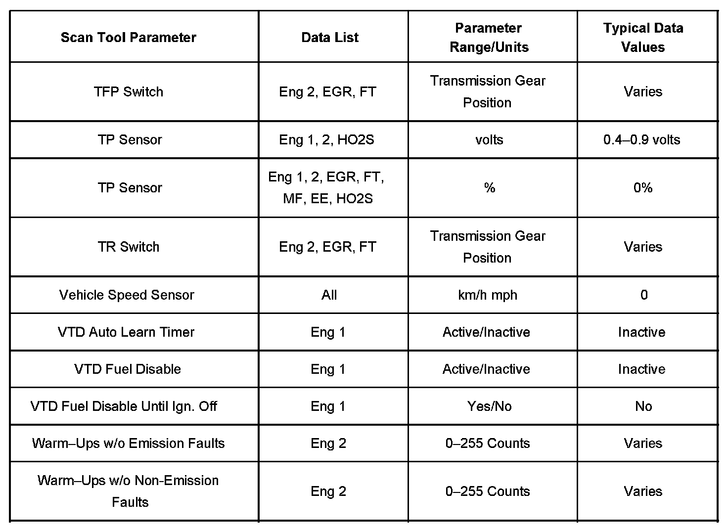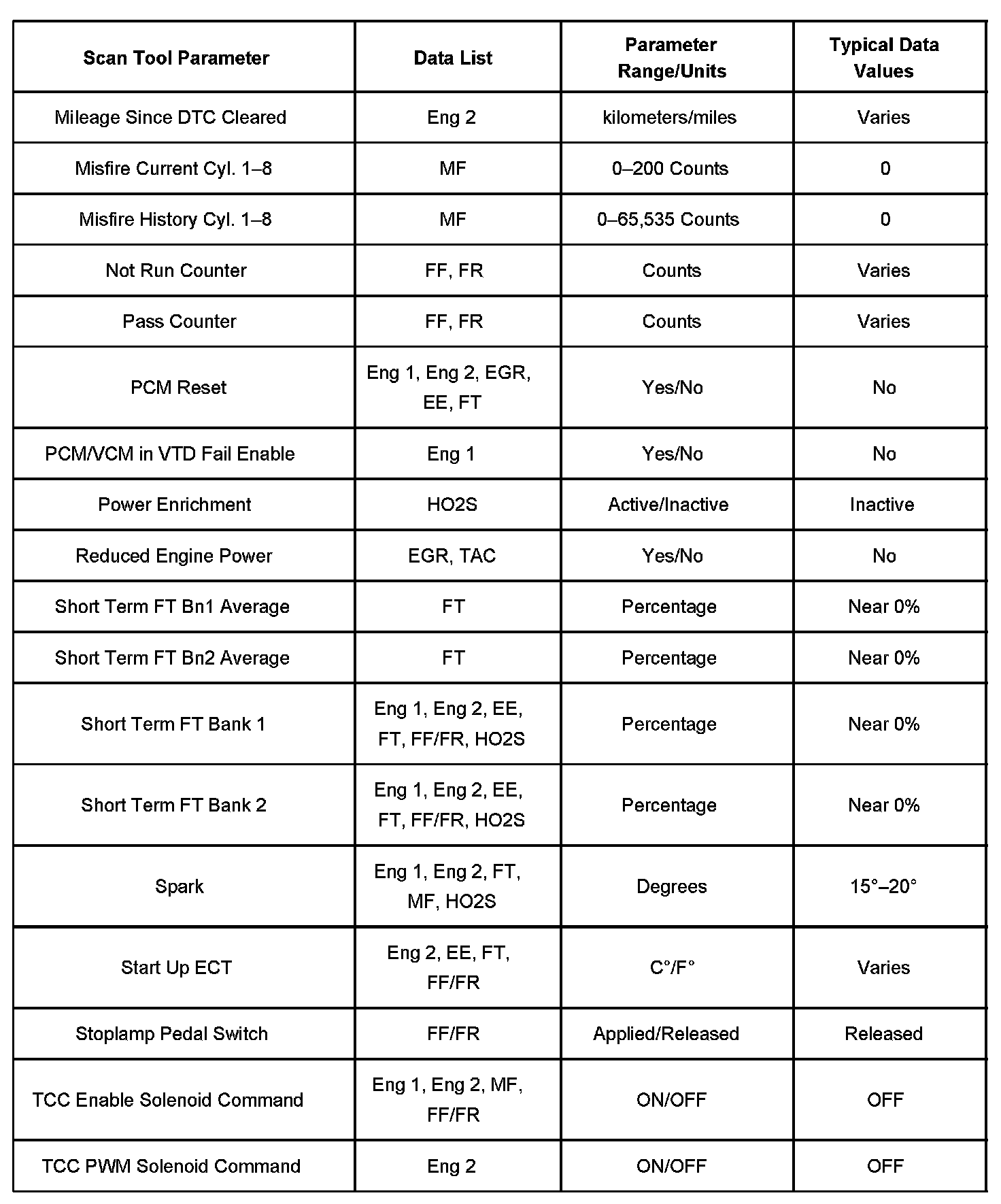 The column labeled Data List indicates where a parameter can be located on the scan tool. Refer to the scan tool operating manual for the exact locations of the data lists. The following is a description of each term listed: