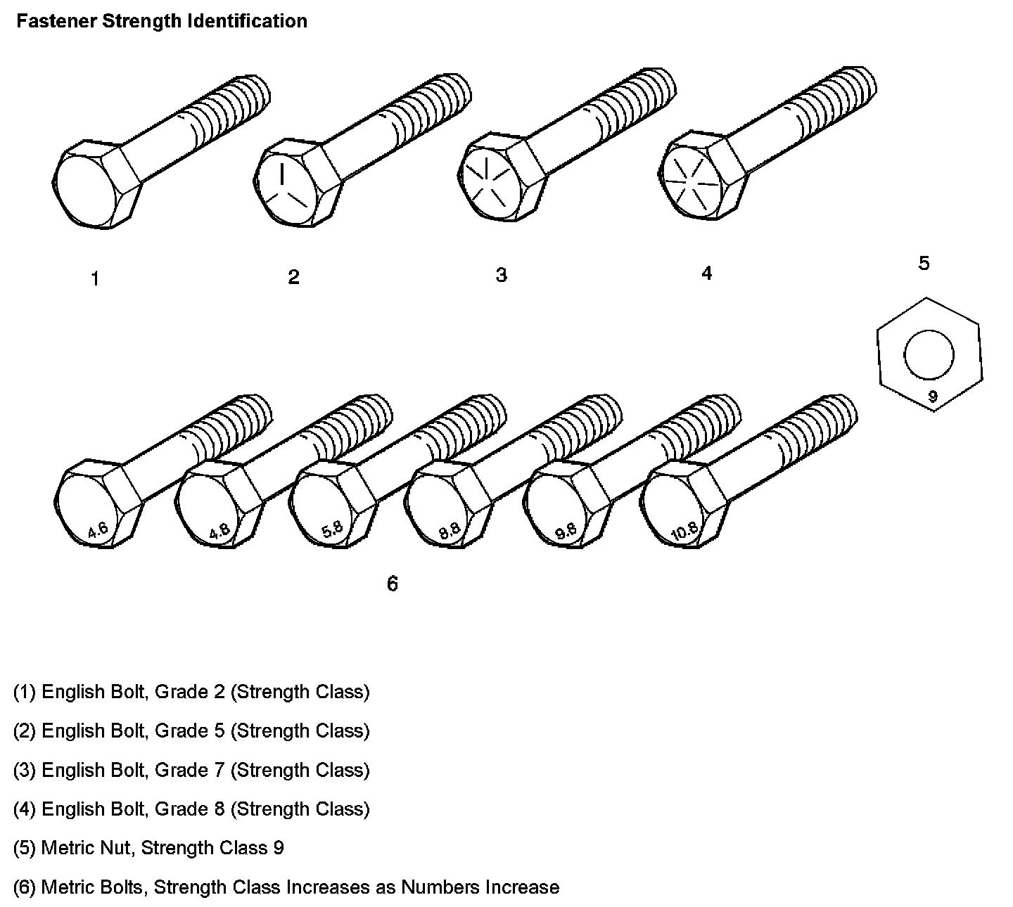 The most commonly used metric fastener strength property classes are 9.8 and 10.9. The class identification is embossed on the head of each bolt. The English, inch strength classes range from grade 2 to grade 8. Radial lines are embossed on the head of each bolt in order to identify the strength class. The number of lines on the head of the bolt is 2 lines less than the actual grade. For example, a grade 8 bolt will have 6 radial lines on the bolt head. Some metric nuts are marked with a single digit strength identification number on the nut face.