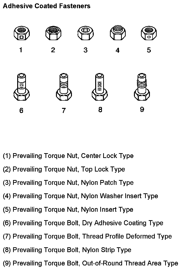 These fasteners accomplish the thread interface by the presence of a thread-locking compound on the fastener threads. Refer to the appropriate repair procedure in order to determine if the fastener may be reused and the applicable thread-locking compound to apply to the fastener.