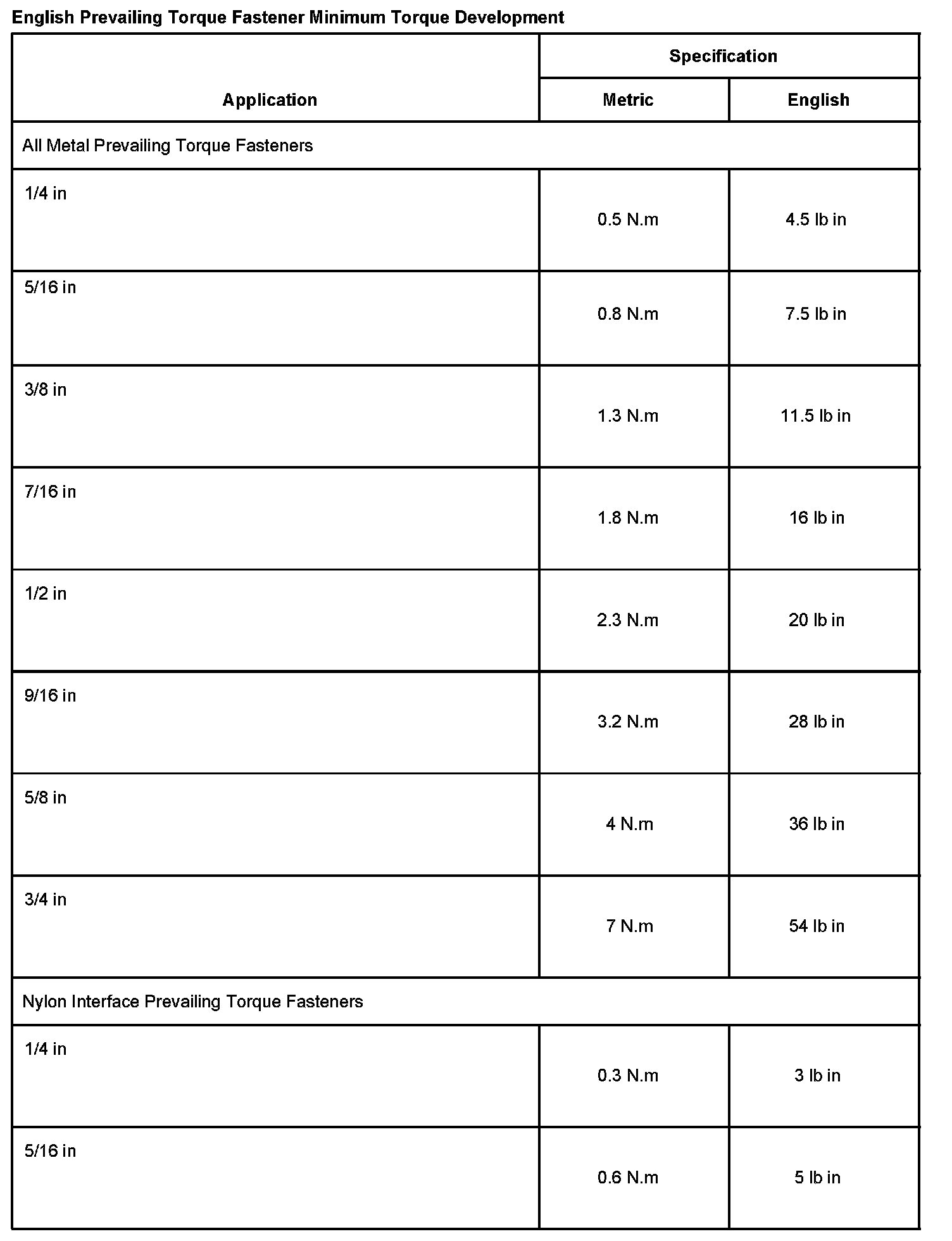 ENGLISH PREVAILING TORQUE FASTENER MINIMUM TORQUE DEVELOPMENT