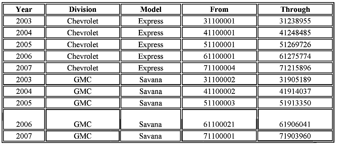 Involved are certain 2003-2007 Chevrolet Express and GMC Savana vehicles built within the VIN breakpoints shown.