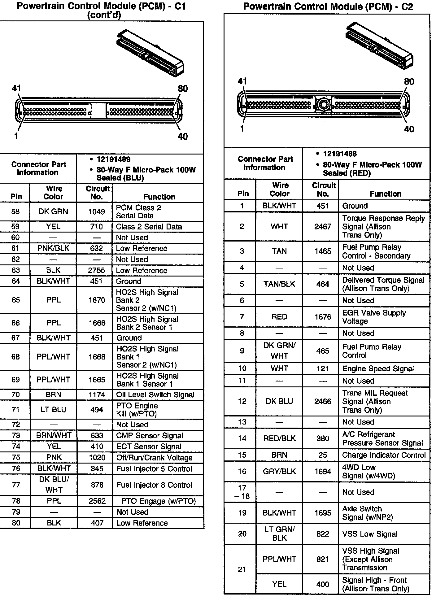 Powertrain Control Module (PCM) C1 Pins 58 - 80 & Powertrain Control Module (PCM) C2 Pins 1 - 21: