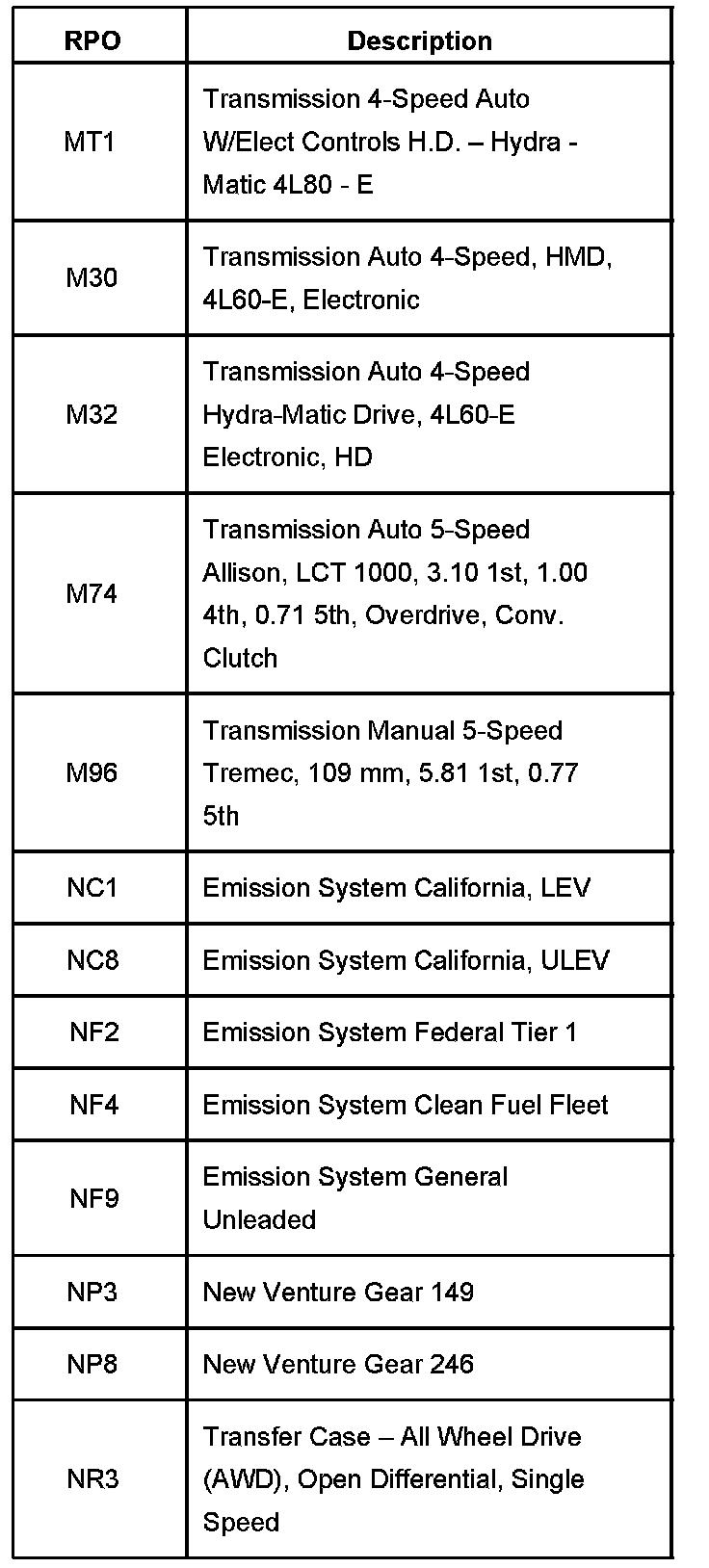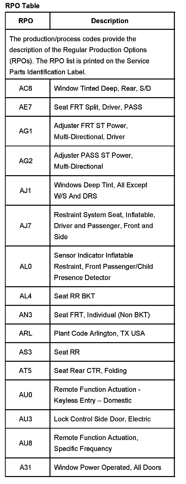 RPO Code List Part 1: