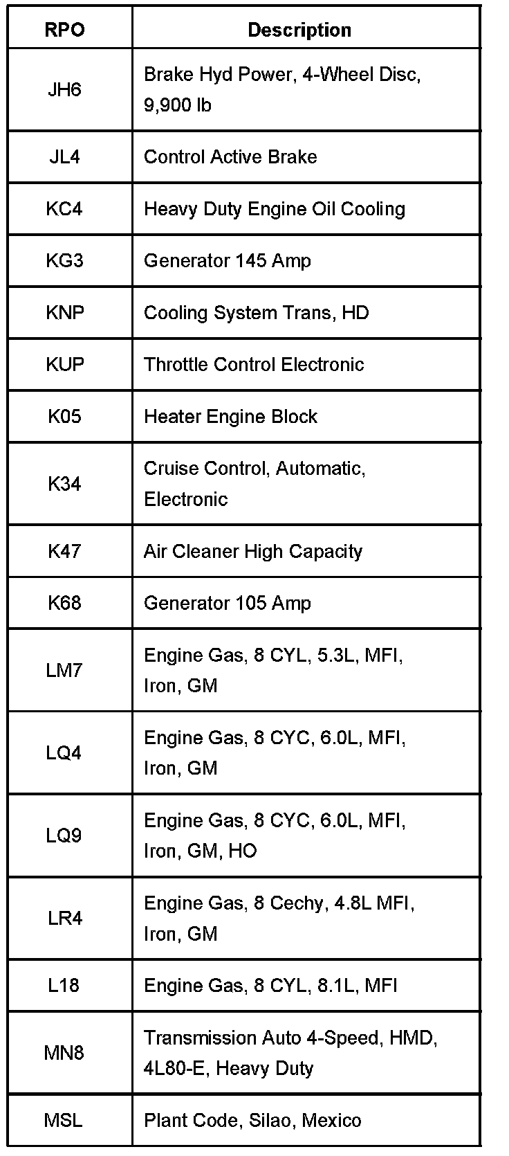 RPO Codes