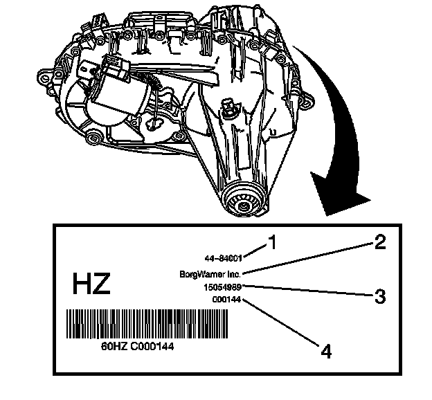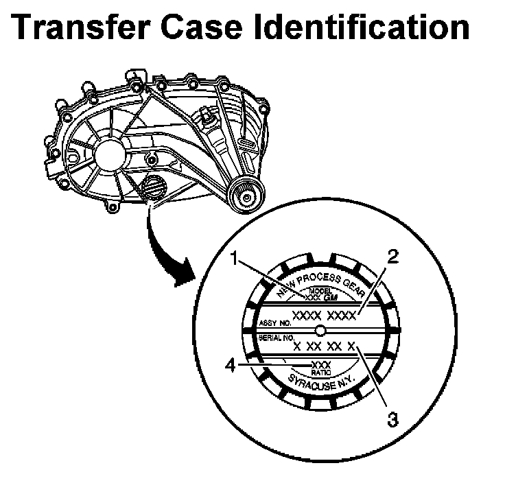 An identification tag is attached to the rear half of the transfer case. The tag provides the following information: