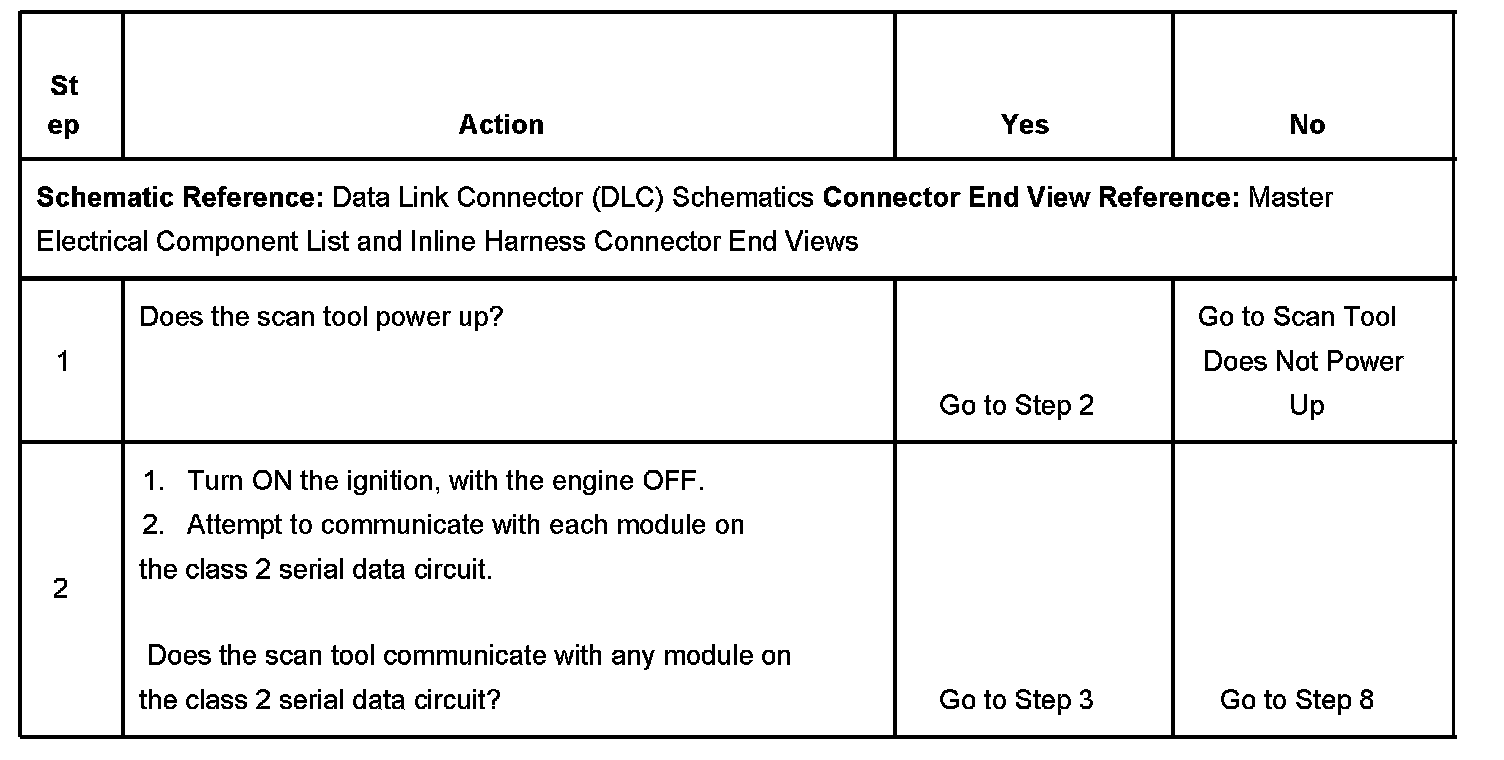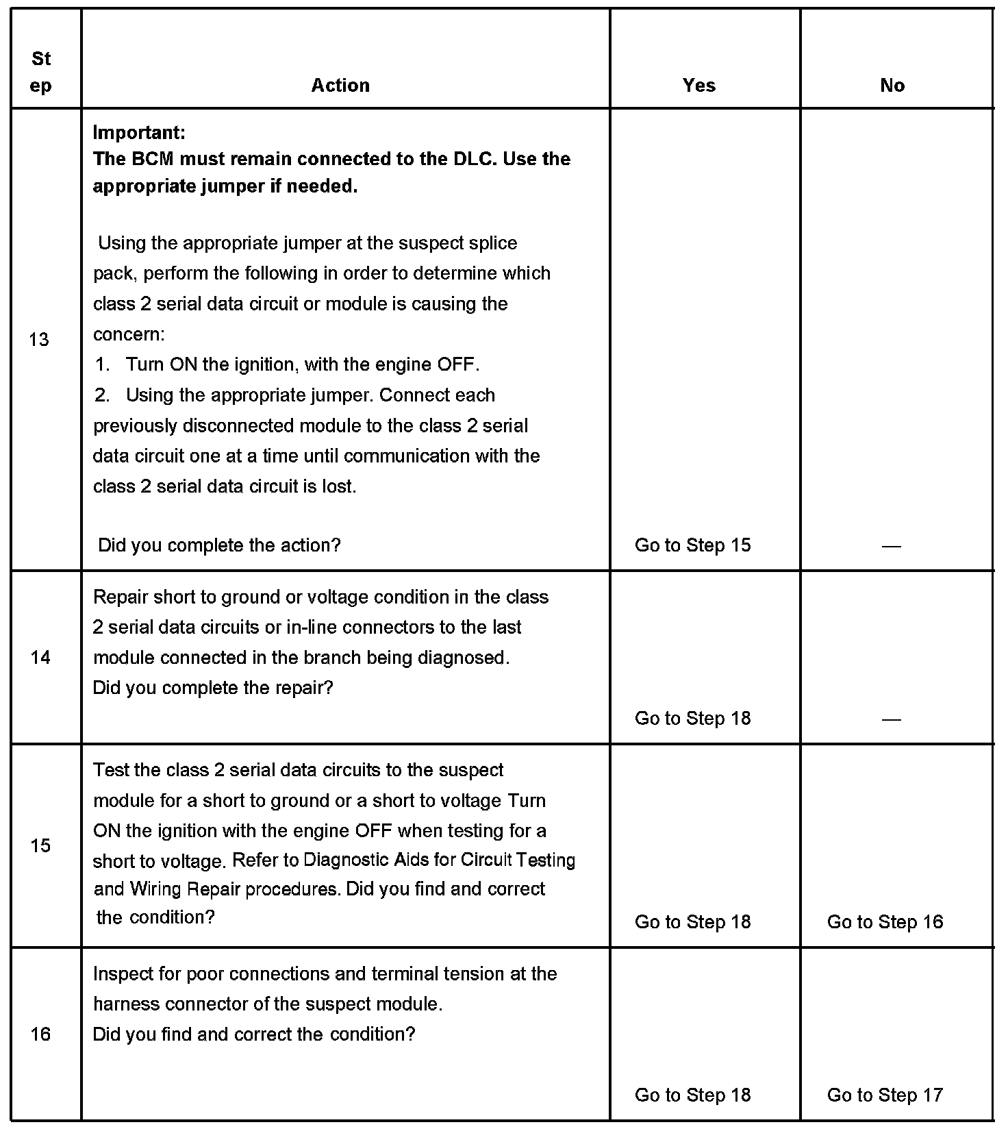13. Normal class 2 serial data communication cannot take place until the body control module (BCM) module sends the appropriate power mode message. If the BCM does not send a wake-up message, other modules on the class 2 serial data circuit may not communicate.