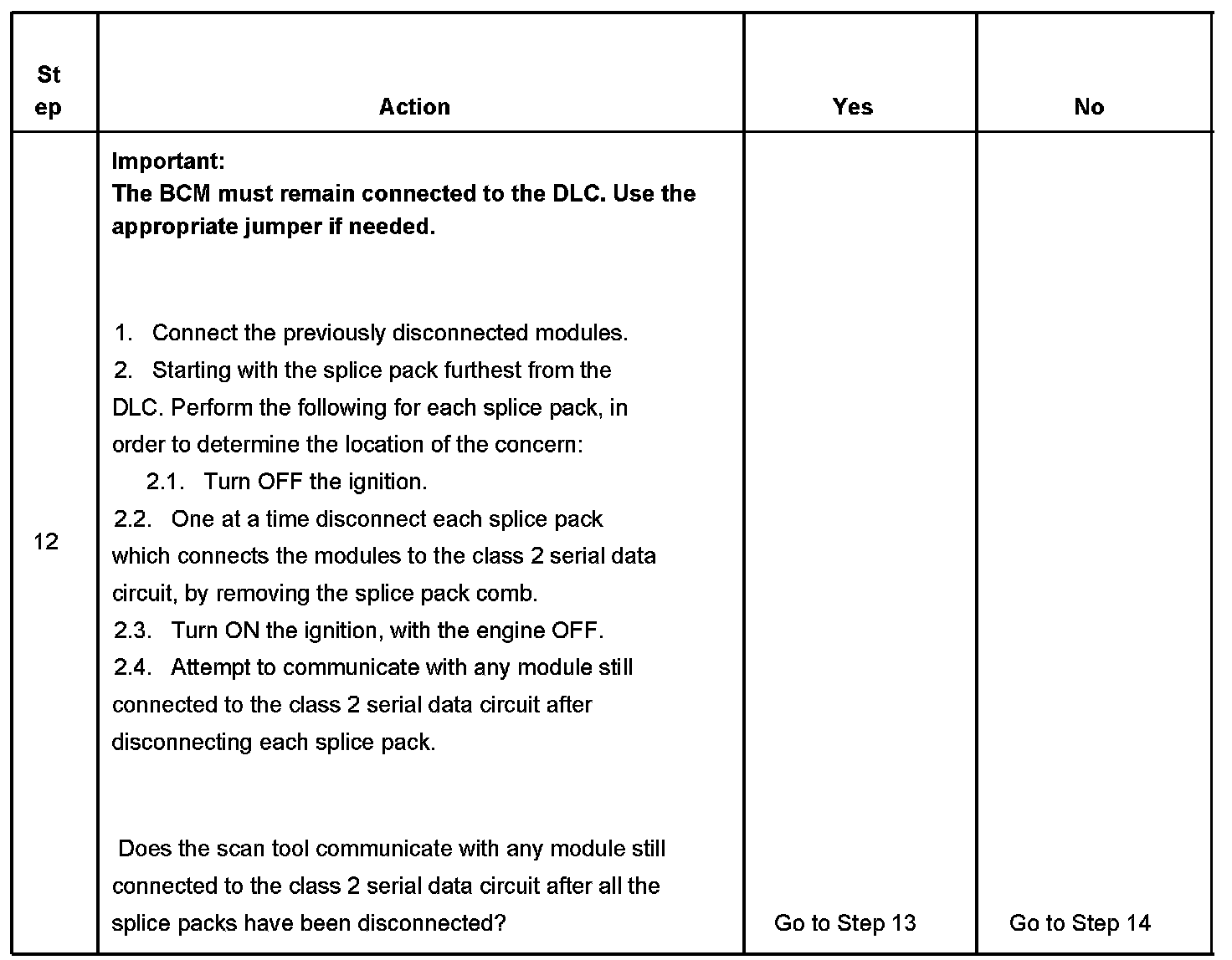 12. Normal class 2 serial data communication cannot take place until the body control module (BCM) module sends the appropriate power mode message. If the BCM does not send a wake-up message, other modules on the class 2 serial data circuit may not communicate.