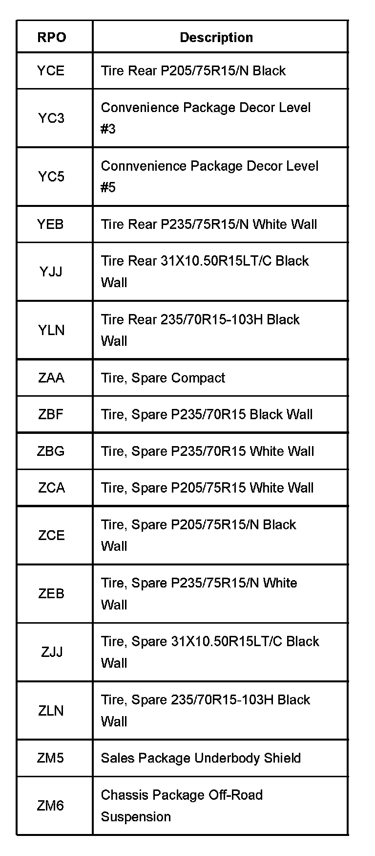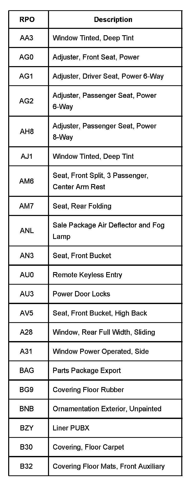 RPO Code List Part 1: