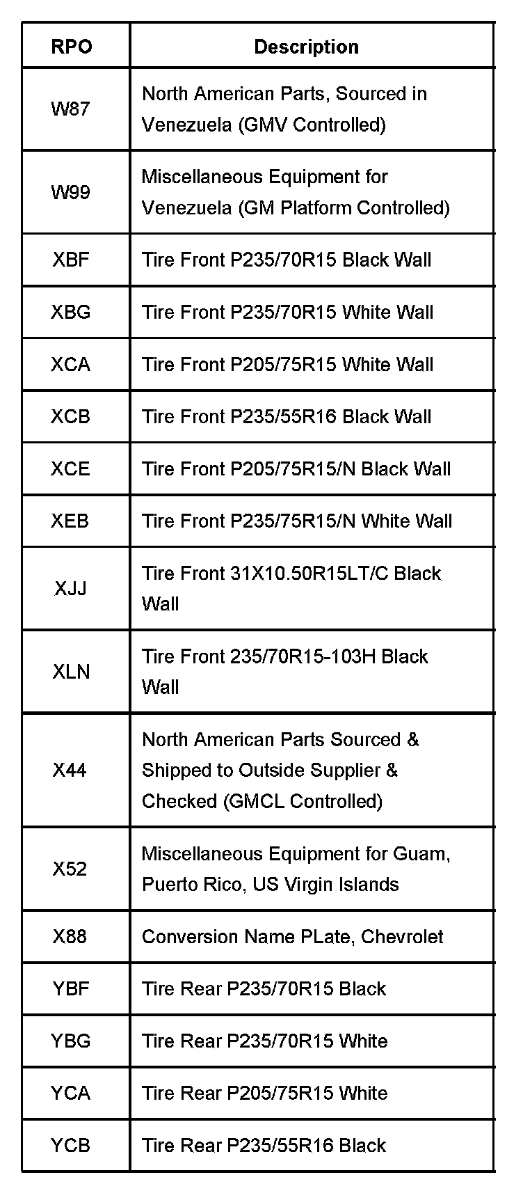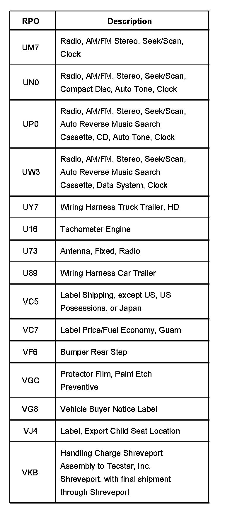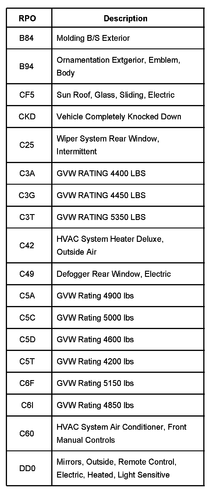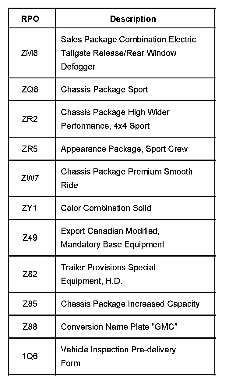 The production/process codes provide the description of the Regular Production Options (RPOs) used on the vehicle. The RPO list is printed on the Service Parts Identification Label. This is a list of the RPO abbreviations and the description.