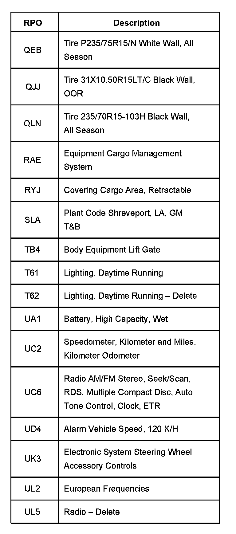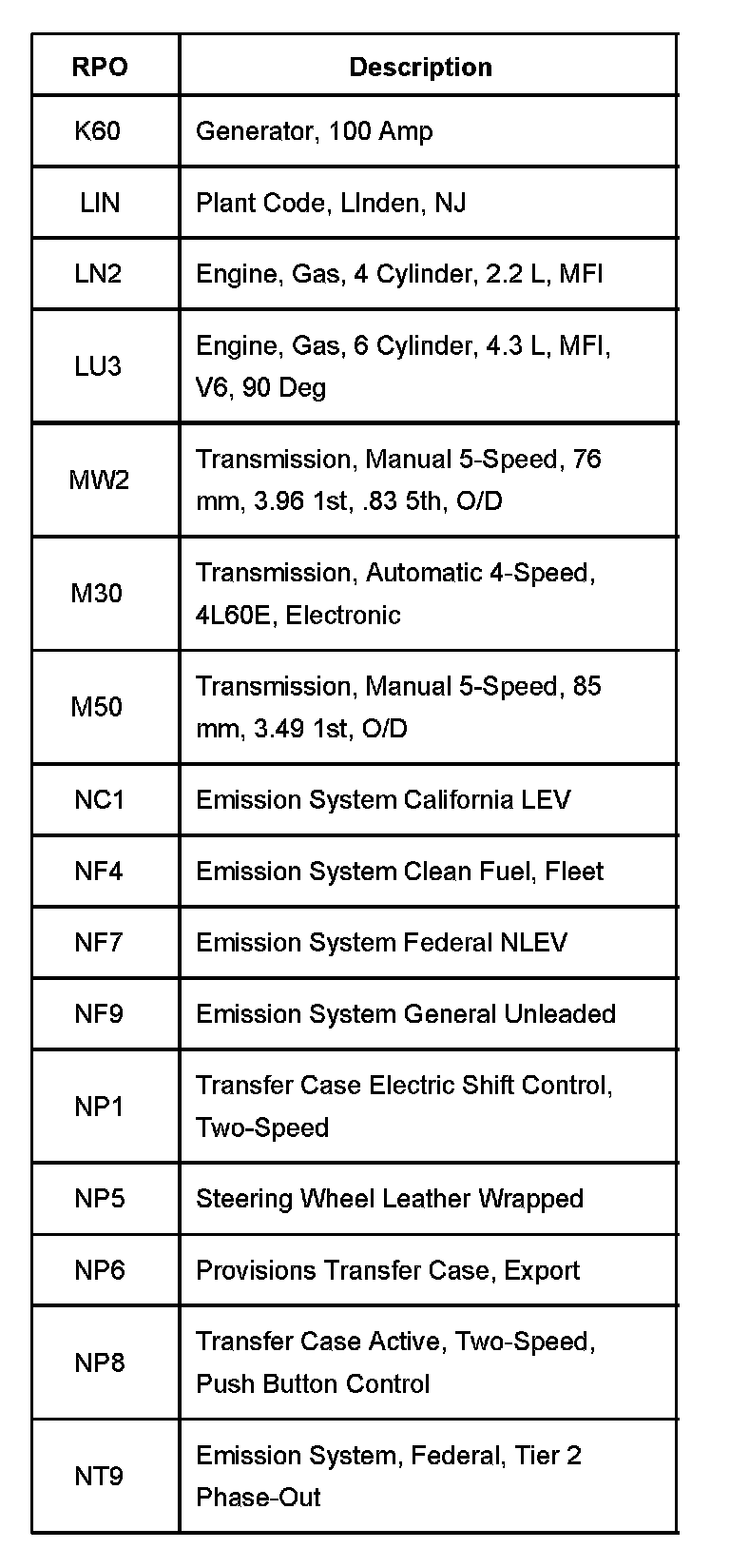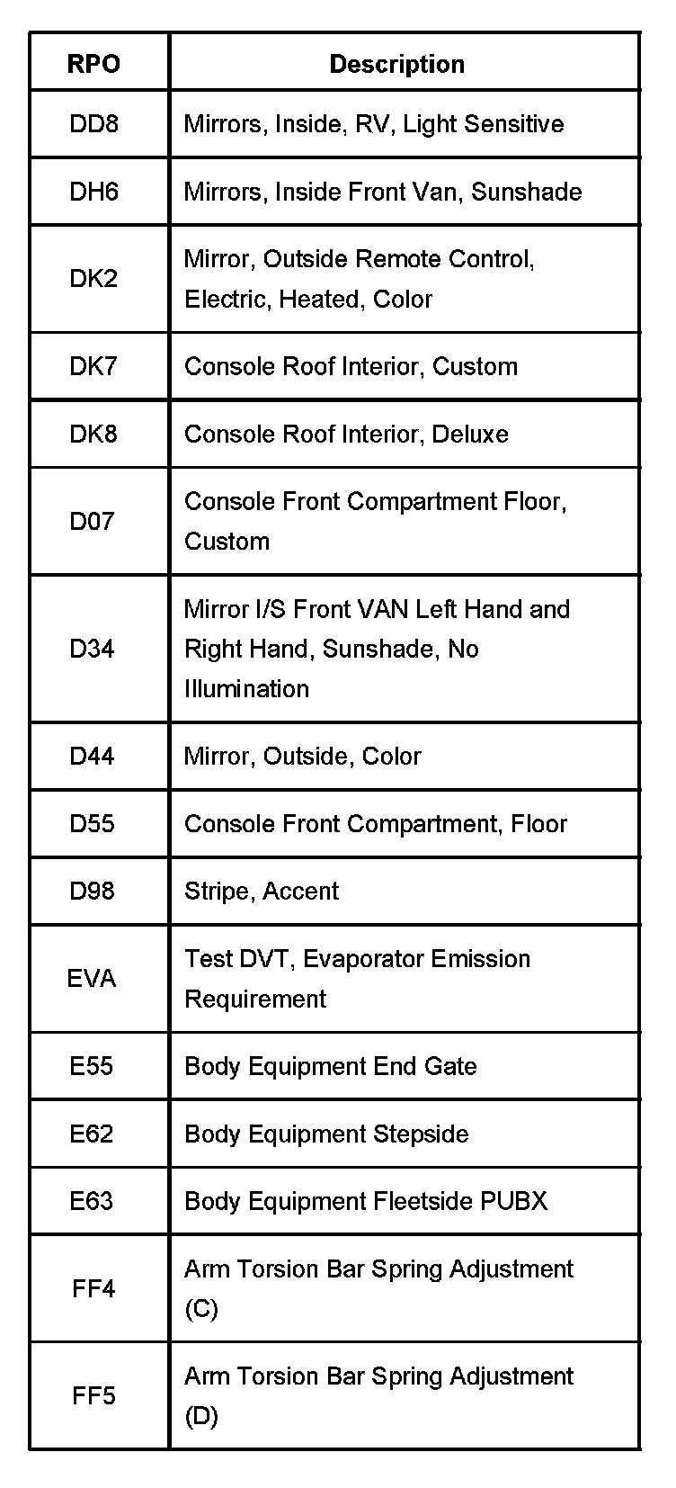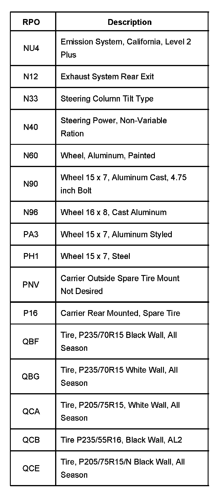 The production/process codes provide the description of the Regular Production Options (RPOs) used on the vehicle. The RPO list is printed on the Service Parts Identification Label. This is a list of the RPO abbreviations and the description.