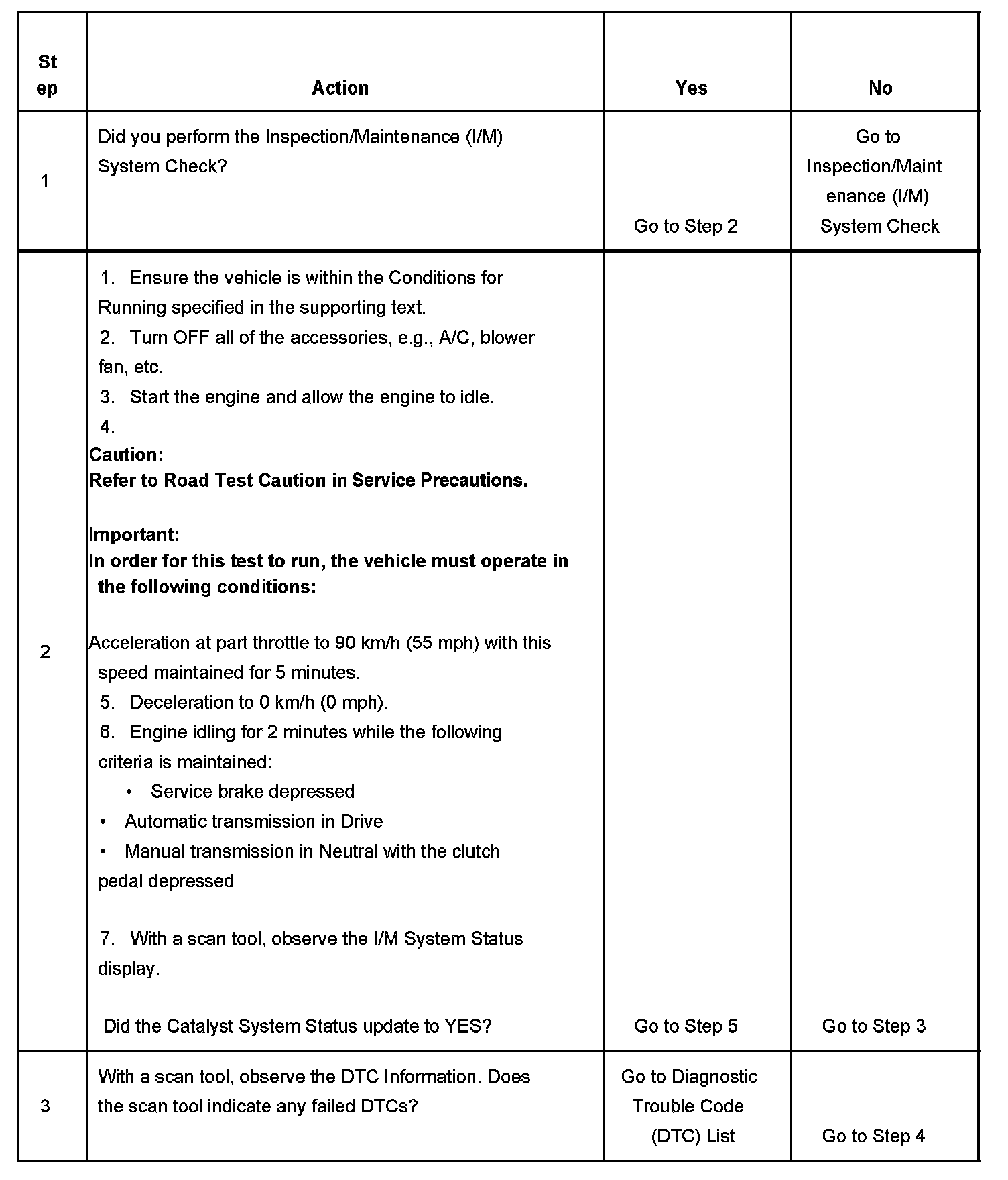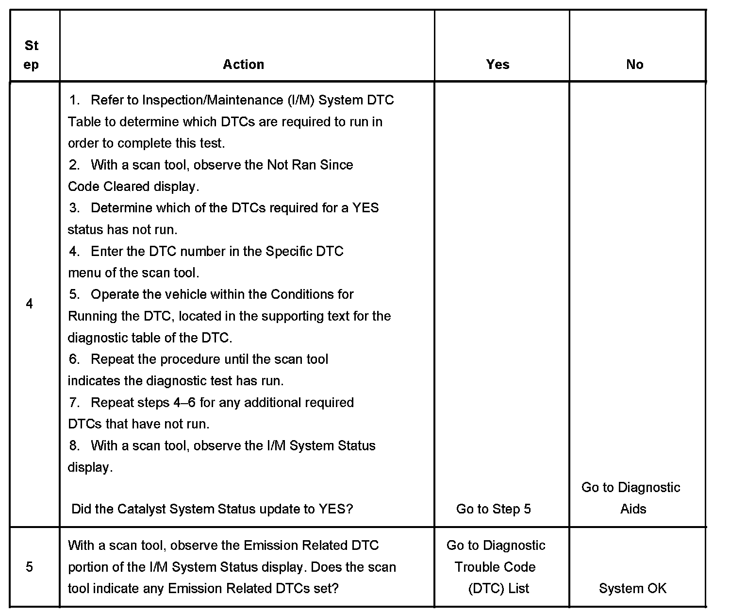 3. This step is to identify a first failure of a type B DTC. A DTC only appears on the I/M System Status display when the DTC becomes a MIL illuminating DTC. This occurs on the second failure of a type B DTC. A first failure of a type B DTC will not allow the I/M System Status to update to YES. Refer to Diagnostic Aids.