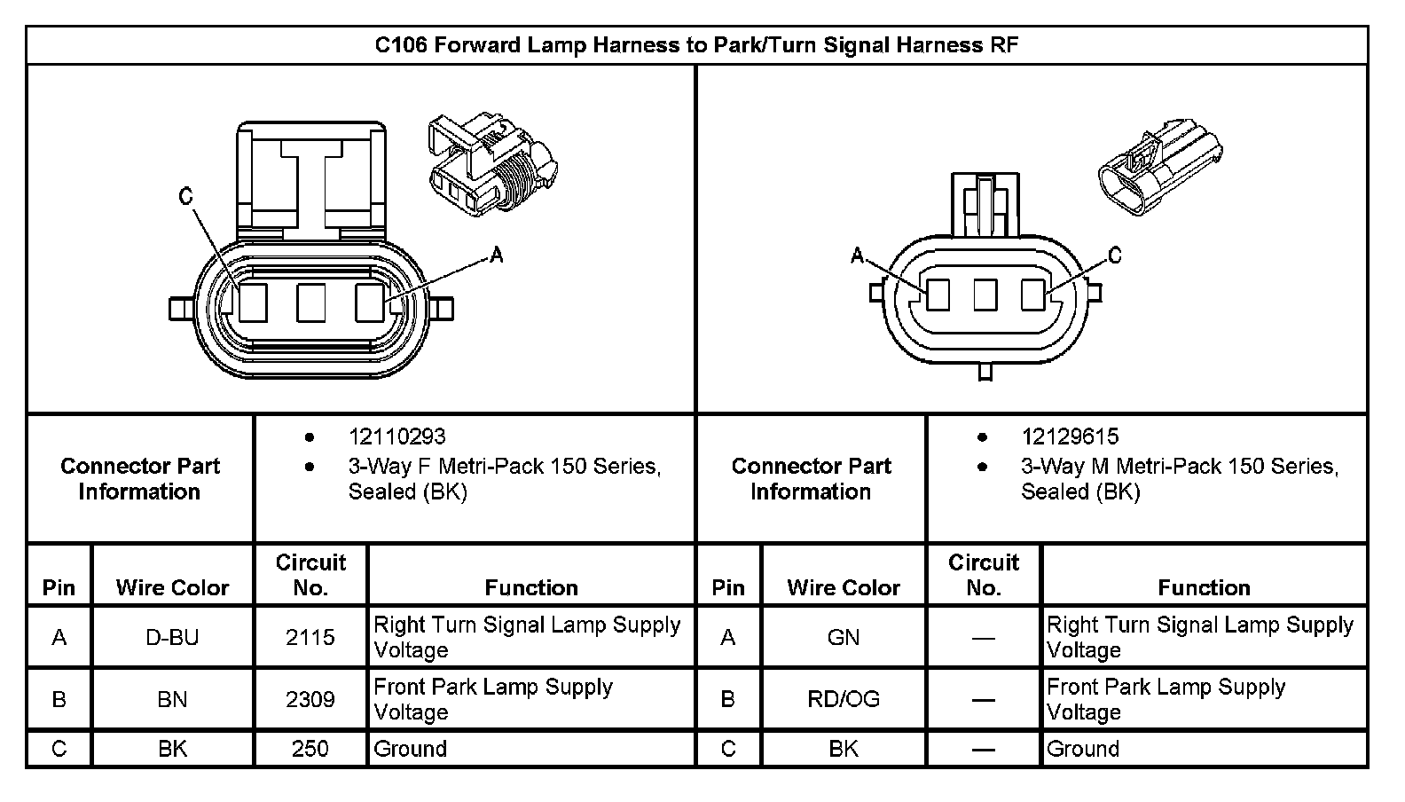 C106 Forward Lamp Harness To Park/Turn Signal Harness RF: