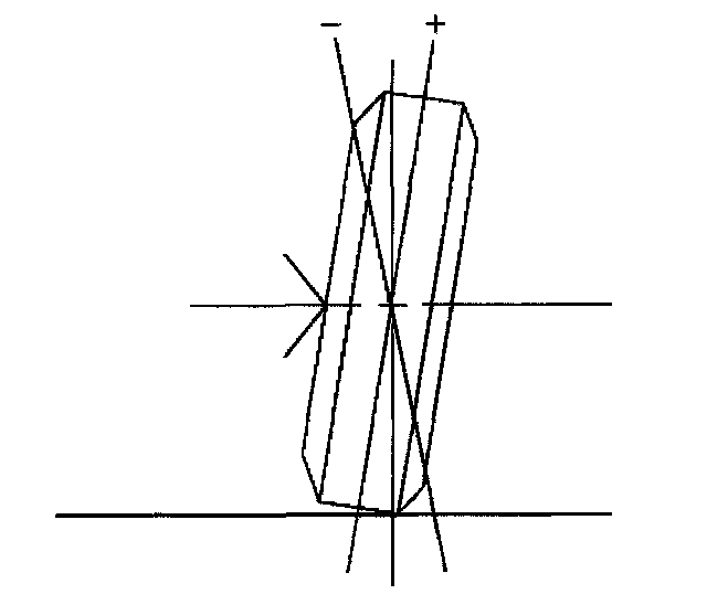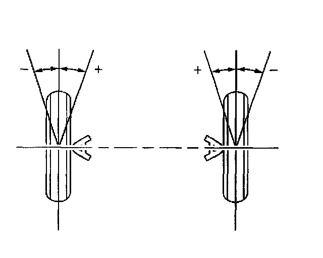 Camber is the tilting of the wheels from the vertical when viewed from the front of the vehicle. When the wheels tilt outward at the top, the camber is positive (+). When the wheel tilts inward at the top, the camber is negative (-). The amount of tilt is measured in degrees from the vertical. Camber settings influence the directional control and the tire wear.