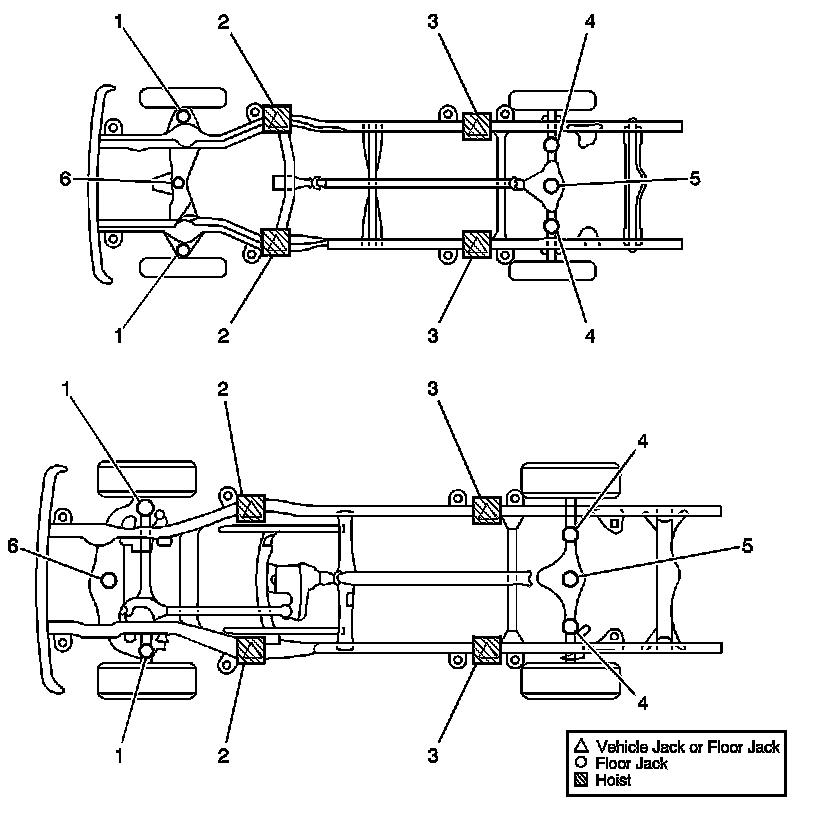 Caution: To avoid any vehicle damage, serious personal injury or death when major components are removed from the vehicle and the vehicle is supported by a hoist, support the vehicle with jack stands at the opposite end from which the components are being removed.