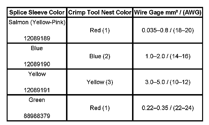 4. Select the proper duraseal splice sleeve according to the wire size. Refer to the above table at the beginning of the repair procedure for the color coding of the duraseal splice sleeves and the crimp tool nests.