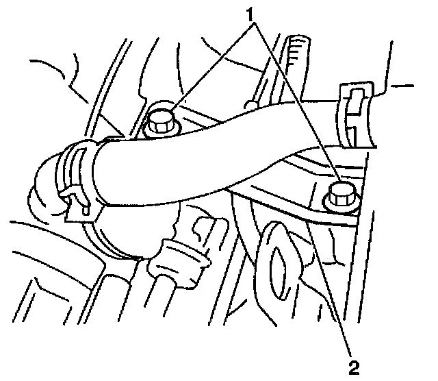 7. Remove the hold down bracket bolt (1) for the fuel pipes (2).
