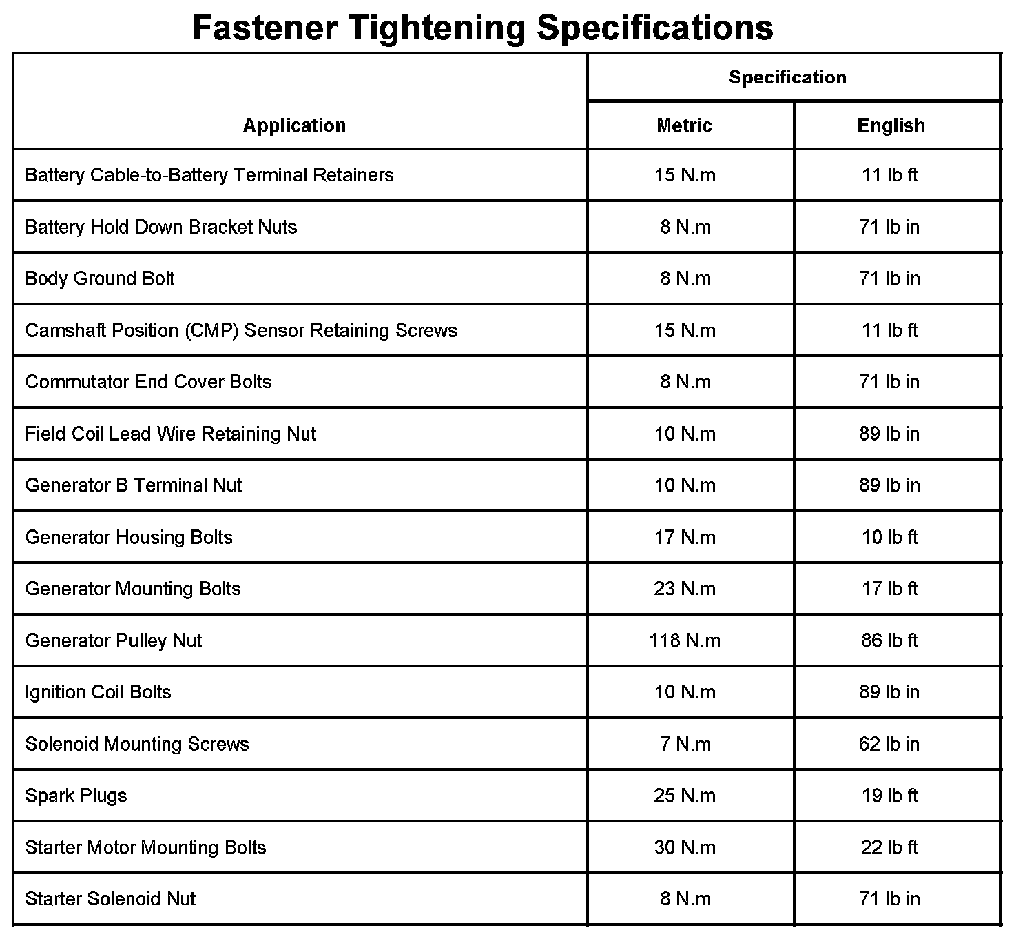 Fastener Tightening Specifications:
