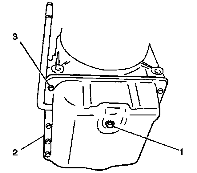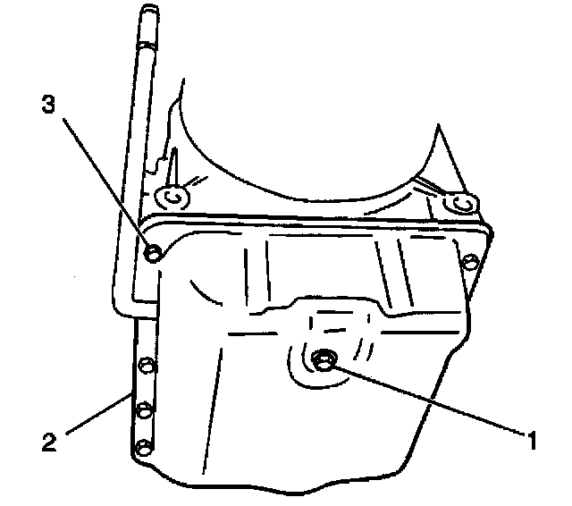 9. Remove the 14 transmission fluid pan bolts (3) from the transmission fluid pan.