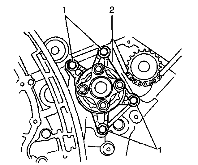 5. Remove the water pump bolts (1) and the water pump (2)