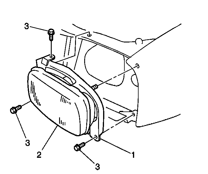 1. Install the headlamp assembly (1,2) to the vehicle. Secure the assembly with the 3 bolts (3).