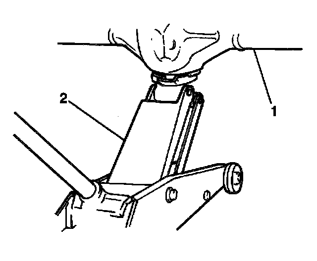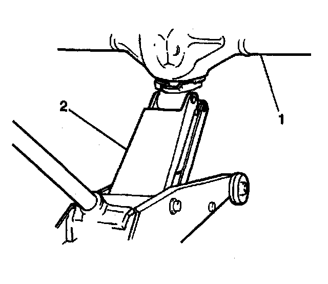 7. Slowly raise the rear axle housing (1) with a hydraulic floor jack (2) until the rear coil springs are positioned in the upper spring seats.