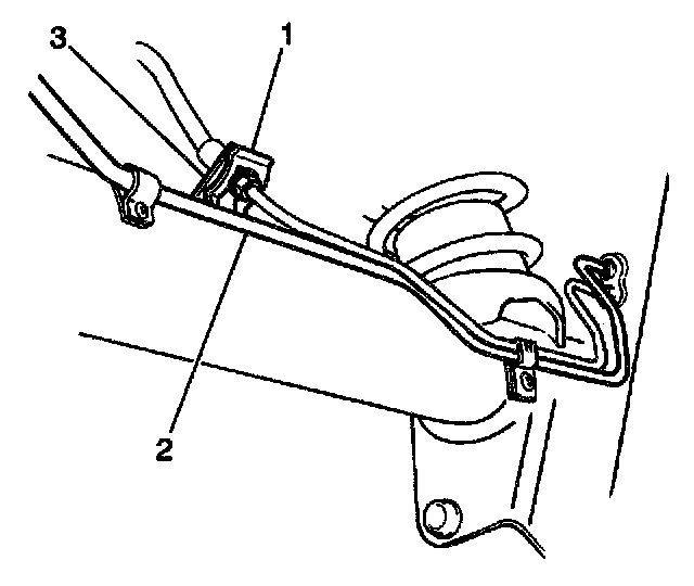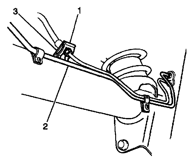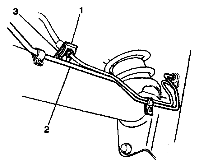 18. Remove the 1 clip (1) and the brake fluid hose from the rear axle housing brake fluid hose bracket (3).