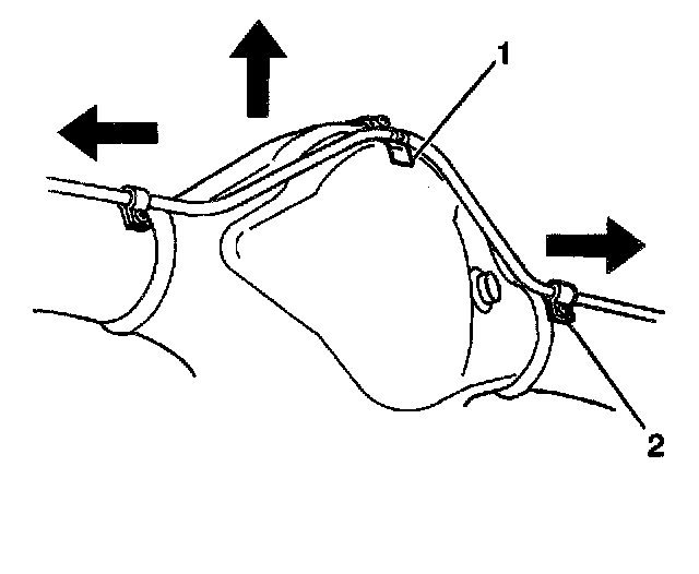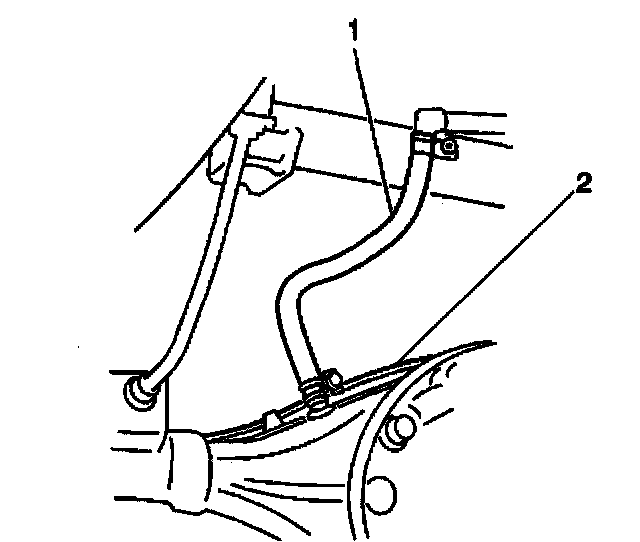 8. Install the rear axle breather hose (1) the rear axle housing (2). Secure the breather hose with the clamp.