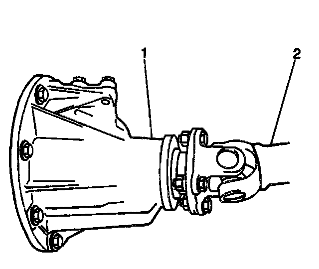 22. Install the rear propeller shaft (2) into the vehicle. Secure with 4 nuts and bolts.