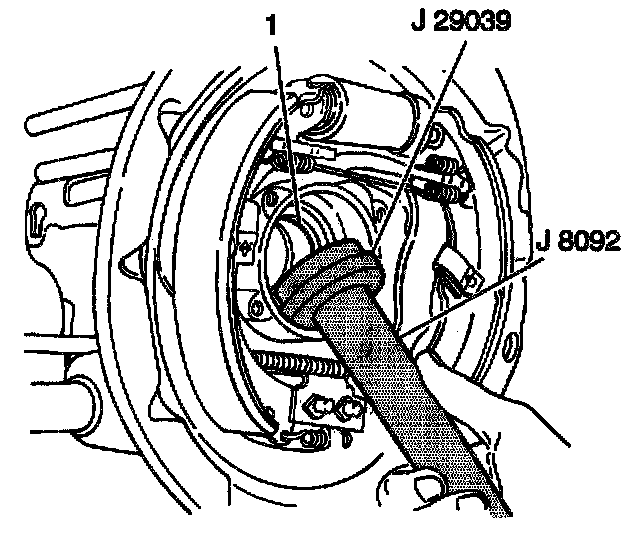 24. Install the new rear axle shaft inner oil seals (1) into the rear axle housing using the J 29039 J 8092.