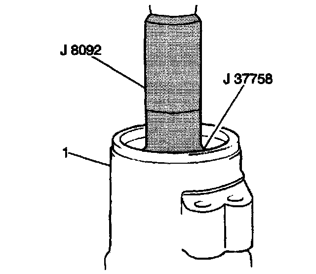 ^ Use the J 37758 with the J 8092, to slowly press the outer pinion bearing race evenly into the differential carrier.